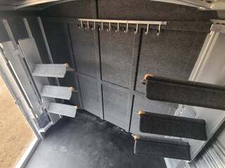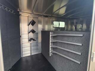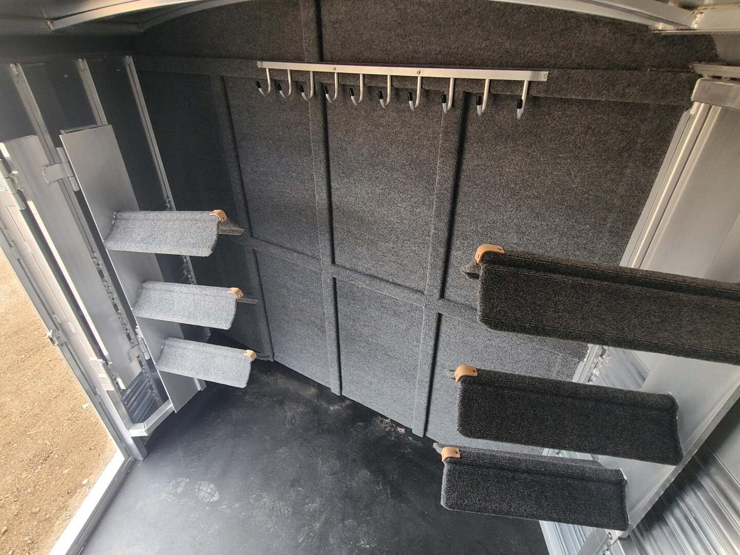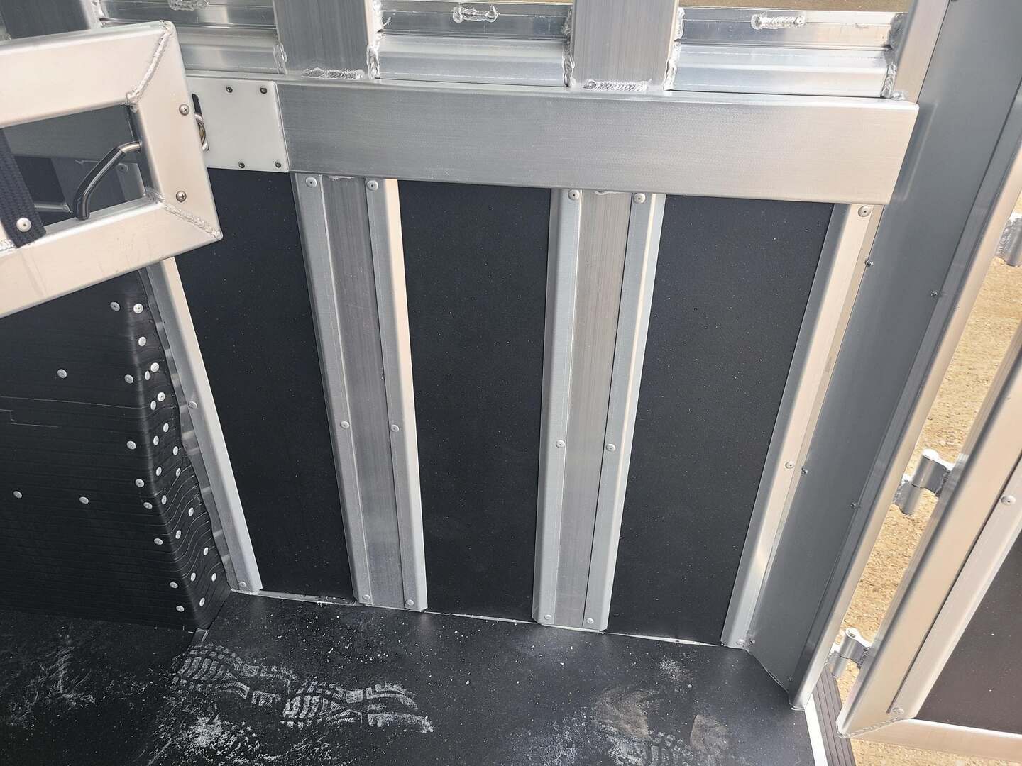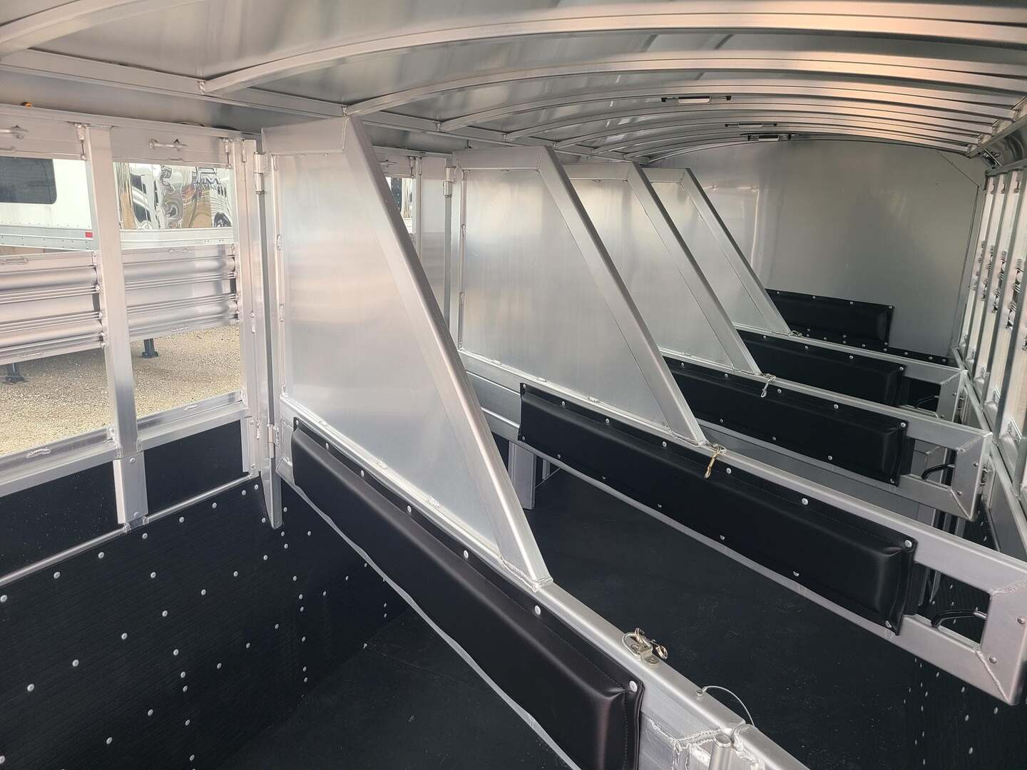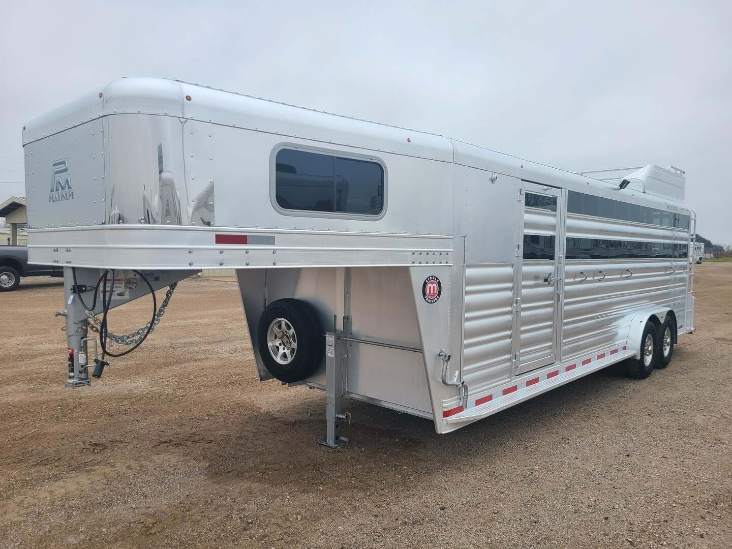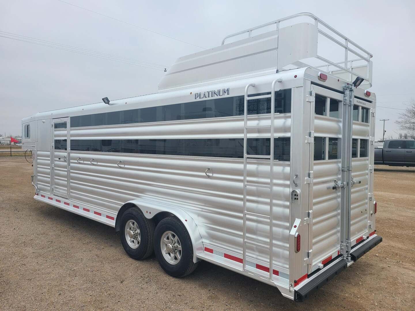 THIS TRAILER IS ON ORDER AND WILL ARRIVE IN APRIL Platinum Coach 24’ Stock Combo 7’6” wide x 24’ long x 7’ tall Mill Finish exterior skin 40” short wall dressing room 3 tier SWING OUT saddle rack on curb side of dressing room 3 tier saddle rack on driver side 4 swinging blanket bars on drop wall Carpeted dressing room, bed, drop and bulkhead wall Carpet on tack door  Brush tray and 5 hooks on tack door 10 hooks on carpeted bulkhead wall Plexiglas & track on both sides, open at the back Rubber on side walls and rear gates 6’ hay rack w ladder Mag aluminum wheels 7,000# axles & 10 ply tires Baby/Stud panel on first divider Break divider on last divider Stock escape door Stainless steel on nose 3 roof vents in horse compartment Double rear doors 4 outside LED load lights LED lights on inside, 2 horse area, 2 tack Dividers can be removed to haul cattle!!