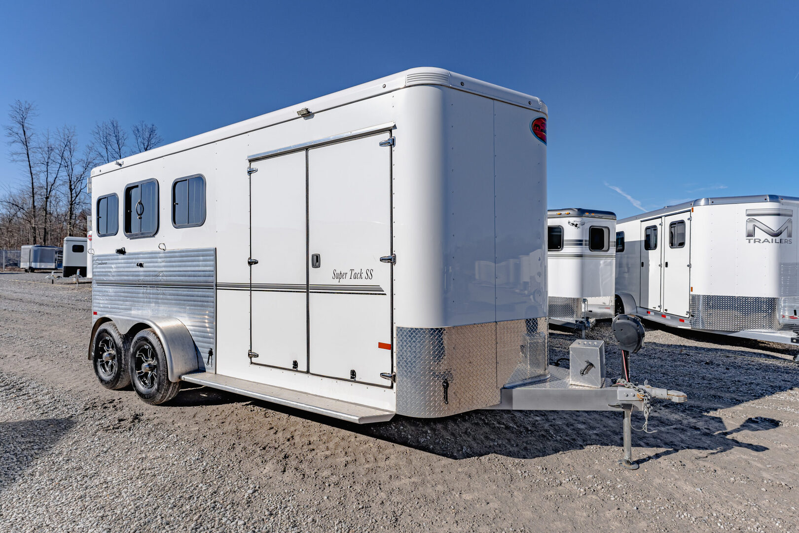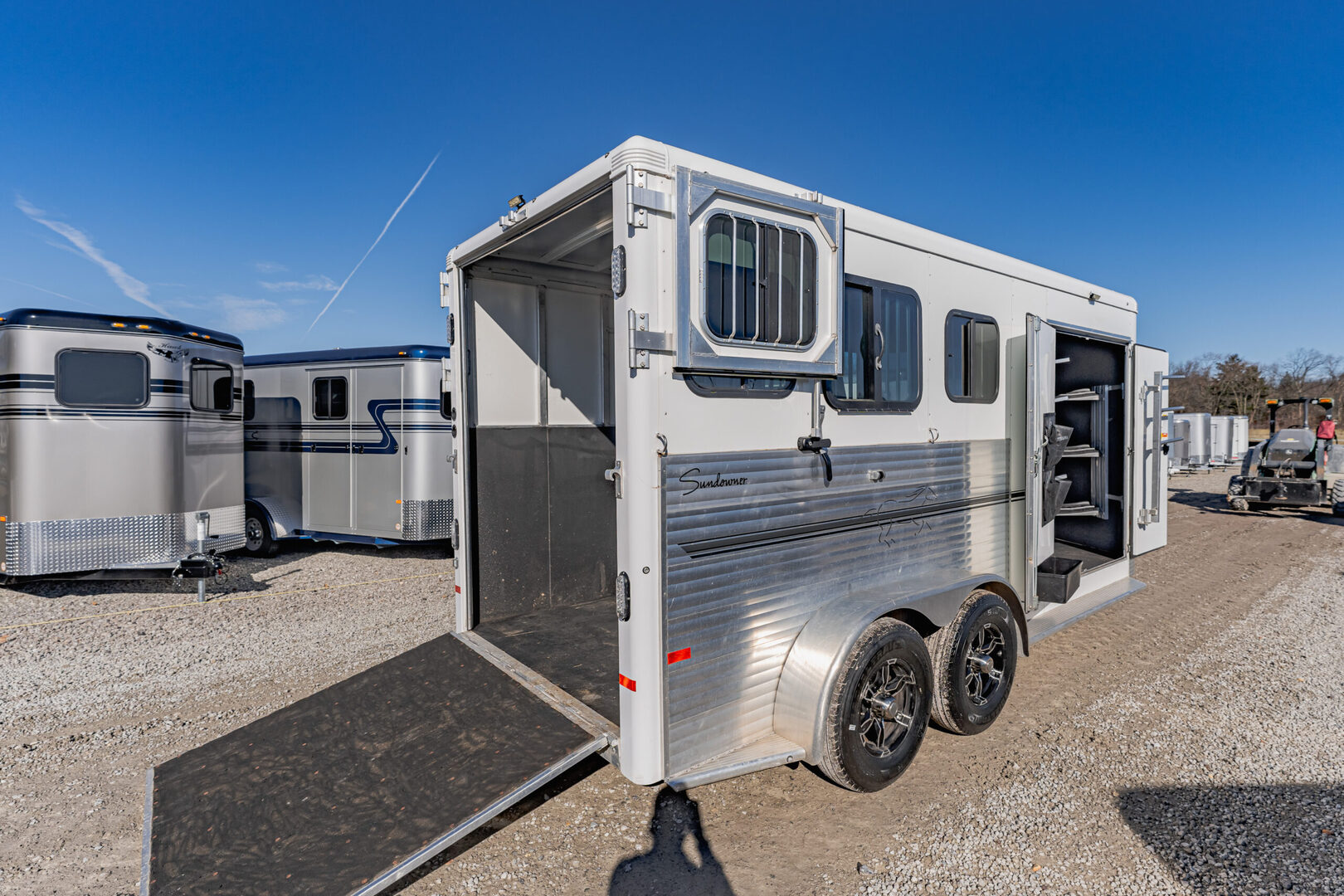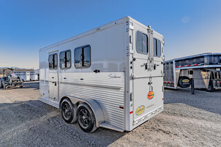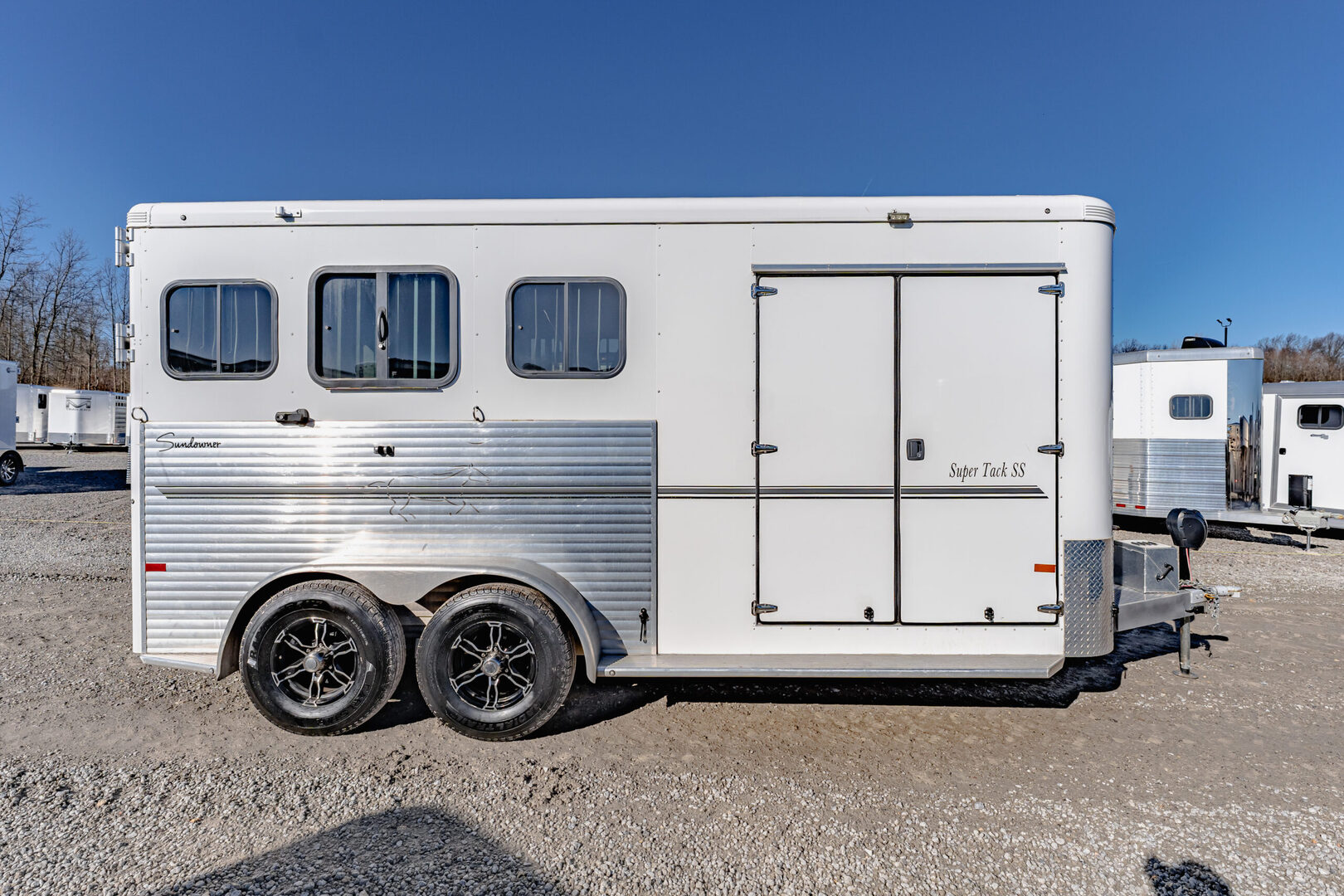 View Inventory: https://leonardtrailers.com/inventory/45816 Stock# 45816 Used 2024 Sundowner Super Tack 3H Horse Trailer  General Information Exterior: XT / SS Construction: Aluminum Primary Color: White Stripe Color: Gray / Black Coupler Size: 2 5/16” Adjustable Coupler Roof: Aluminum Length: 19’ Width: 6’9” Height: 7’6” Horse Configuration Type: Slant Dressing Room Size: 6’ Awning: N/A Awning Style: Slant Dressing Room Options  Lined / Insulated Carpet Lights Hooks Windows Screen Door Camper Door Saddle Rack Location Horse Area Options Mats Pads Vents Lights Hayrack Rubber Lining Complete Escape Type 1 Full Walk Out Tack Area Type: Inside Dress Door / Gate Ramp with Tail Doors Axles / Mechanical / Weight GVW: 9,700 lbs Axle Size: 3,500 lbs Tire Size: 235/80R16 # of Brakes: 4 Breakaway Jacks: Single Ride / Electrical Rubber Ride Spare Brakes: Electric We offer outstanding financing options, accept trades, and can arrange nationwide NO HASSLE delivery! Inquire today for more information! (888) 333-6613 **We believe these specifications to be accurate. Any discrepancies are unintentional. Please verify information with a sales associate prior to purchase.** Stock Number:45816