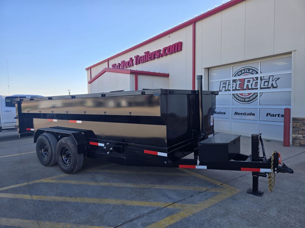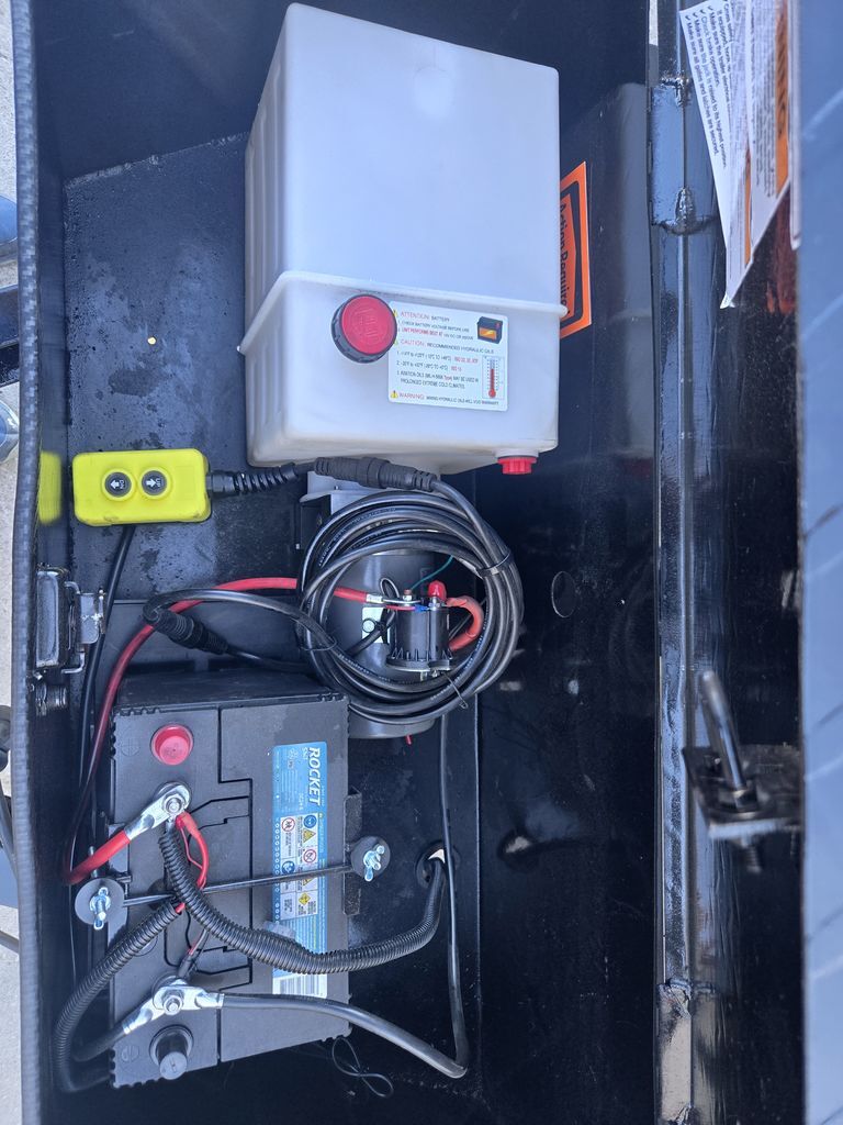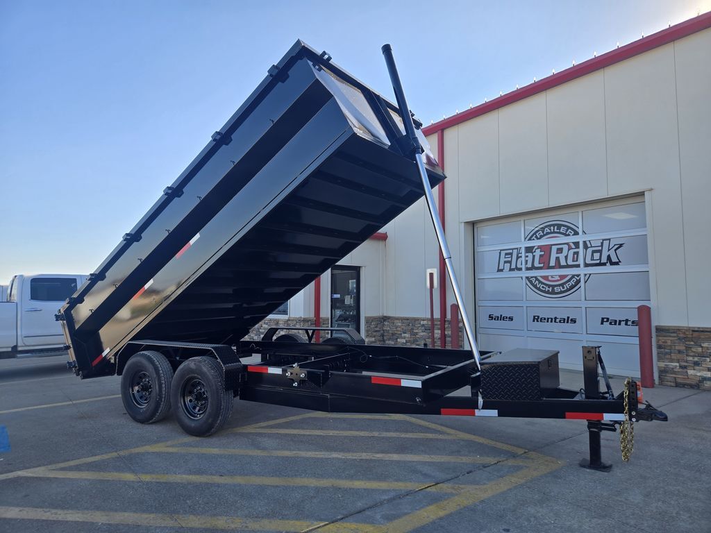 Ramps and Spare Tire (Not included in listed price) 7’ x 16’ x 3’ Dump Trailer (+/13 Cubic Yards) 2 x 8,000 lb. EZ Lube Brake Axles (12 in x 2 in Brakes on Both Axles) Heavy Duty Slipper Spring System ST 235 85 R16 in 14 Ply Radials 2 5/16 in Adjustable Coupler 10K Drop Leg Jack All Flush Mount LED Lights Main Frame: 6 in Channel + 5’ Channel Rear Stiffer Frame Wrapped Tongue 6 in Channel Tilt Frame: 3 in x 2 in Tubing 3 in Channel Cross Members 1/8 in Steel Bed Flooring 1/8 in Steel Side Walls 82 in Deck Width 16’ Deck Length Rear Double Swing Doors 1.7 GPM Electric Over Hydraulic Cylinder 3 Stage Hydraulic Cylinder (14,000 lbs.) 15’ Corded Remote Control 24V Deep Cycle Battery Front Locking Toolbox (Contains Battery and Pump) GVWR: 16,000 lbs. Empty Weight 4,400 lbs. Carrying Capacity 11,600 lbs.