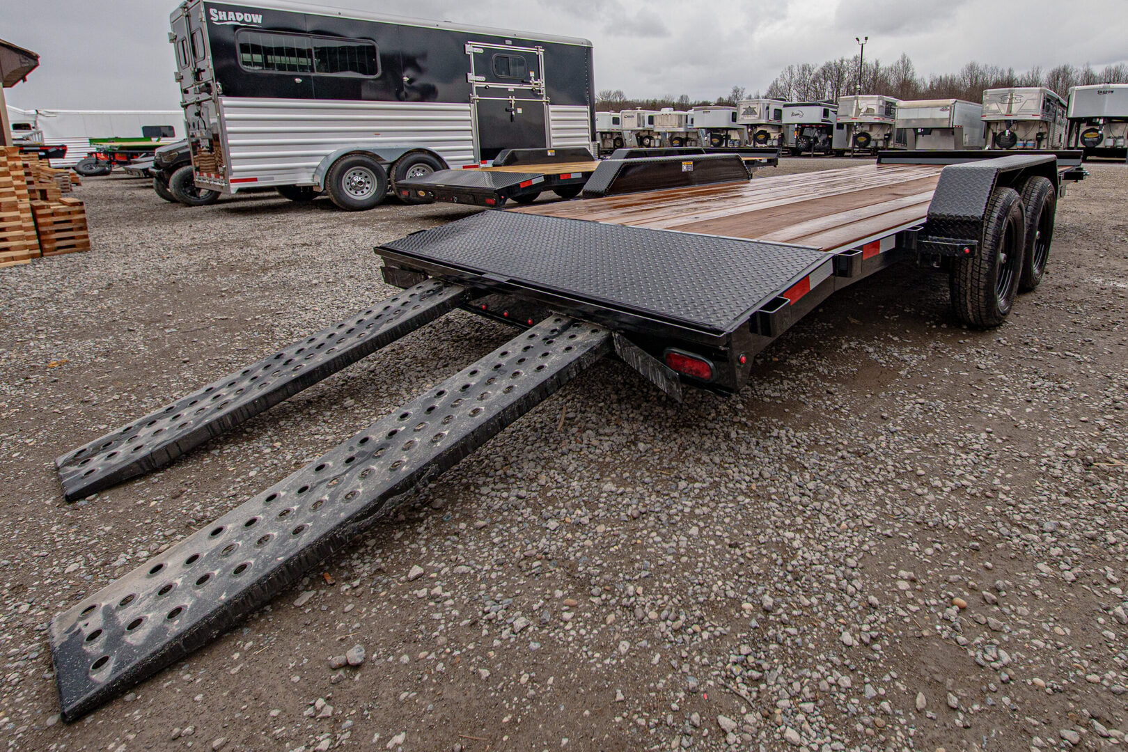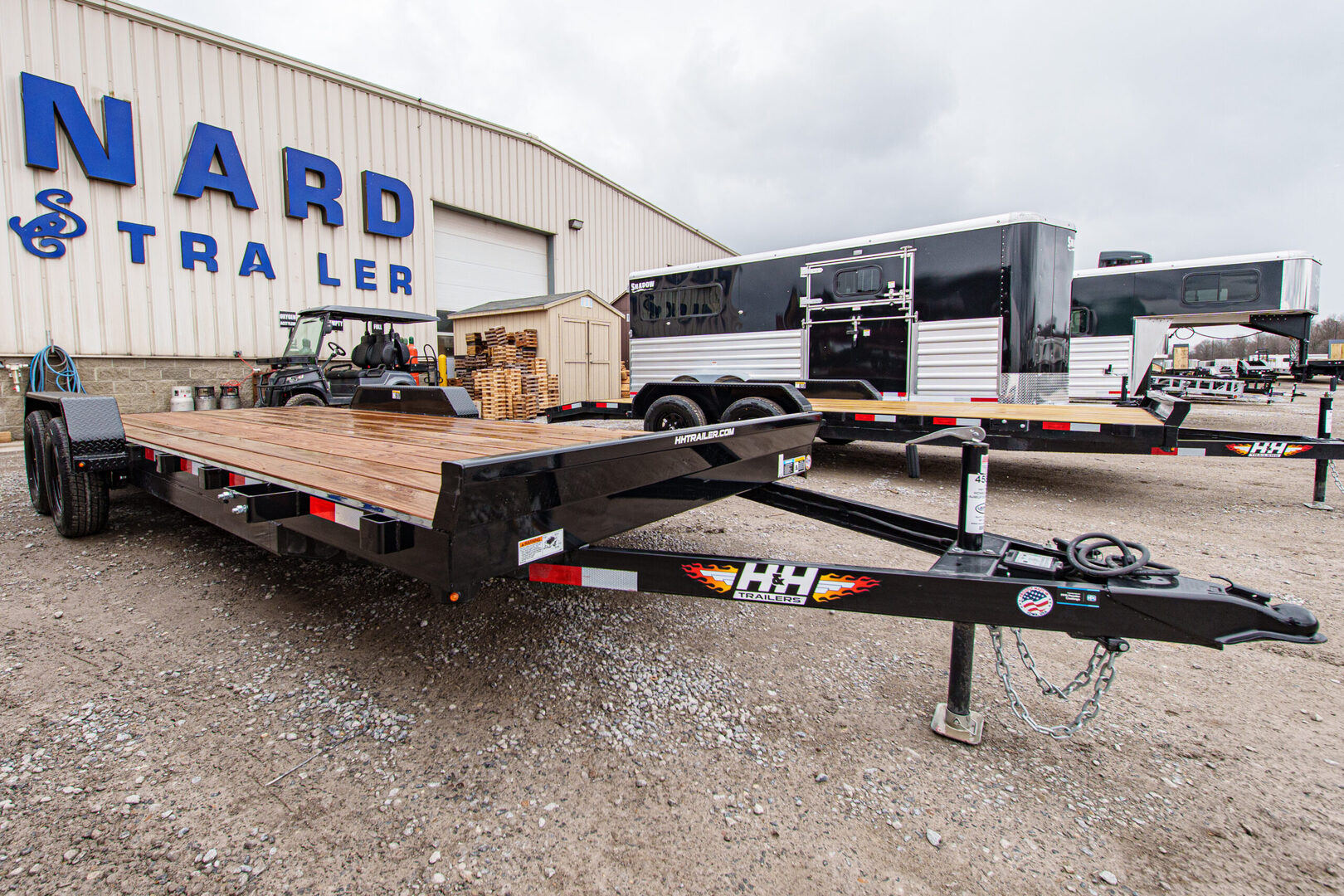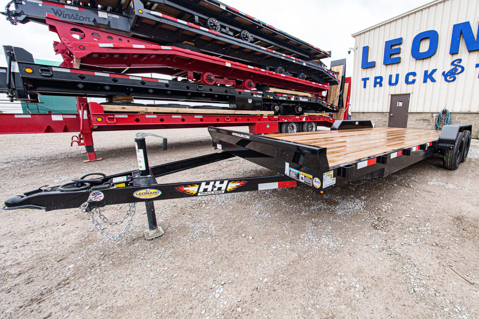 View Inventory: https://leonardtrailers.com/inventory/45855 Stock #45855 – New 2026 H&H 82” x 20’ (18+2) Car Hauler Trailer, 7K Strong and practical, this 82” x 20’ car hauler is built for safely transporting vehicles with reliable features. Key Specs Size: 82” x 20’ (18’+2’ dovetail) Frame: 5” steel channel Crossmembers: 3” steel channel Tongue: 4” steel channel Coupler: 2-5/16” A-frame, Posi-Lock Axles: 2 x 3,500 lb spring brake w/ easy-lube hubs Jack: 2,000 lb set-back Bulkhead: Heavy-duty tube Deck & Loading 2’ steel tread plate dovetail 3” x 66” ladder-style slide-in ramps w/ carrier 2” pressure-treated pine decking w/ board retainers Stake pockets for tie-downs Tires & Wheels ST205/75R15C 6-ply tires 15” 5-hole steel wheels Features & Accessories Double break tread plate fenders DOT-compliant breakaway system (battery, switch, lanyard) Sealed wiring harness w/ 7-pin round plug Full LED exterior lights Spare tire carrier Industrial grade polymer exterior finish Limited 3-year warranty Color: Black A dependable 7K car hauler designed for safe and efficient vehicle transport. We offer outstanding financing options, accept trades, and can arrange nationwide NO HASSLE delivery! Inquire today at (888) 333-6613. We believe these specifications to be accurate. Any discrepancies are unintentional. Please verify all information with a sales associate prior to purchase. Stock Number:45855