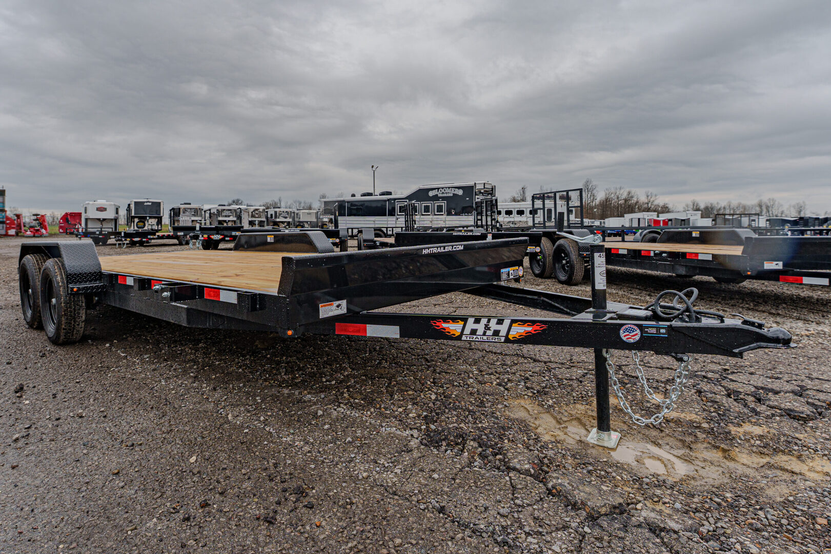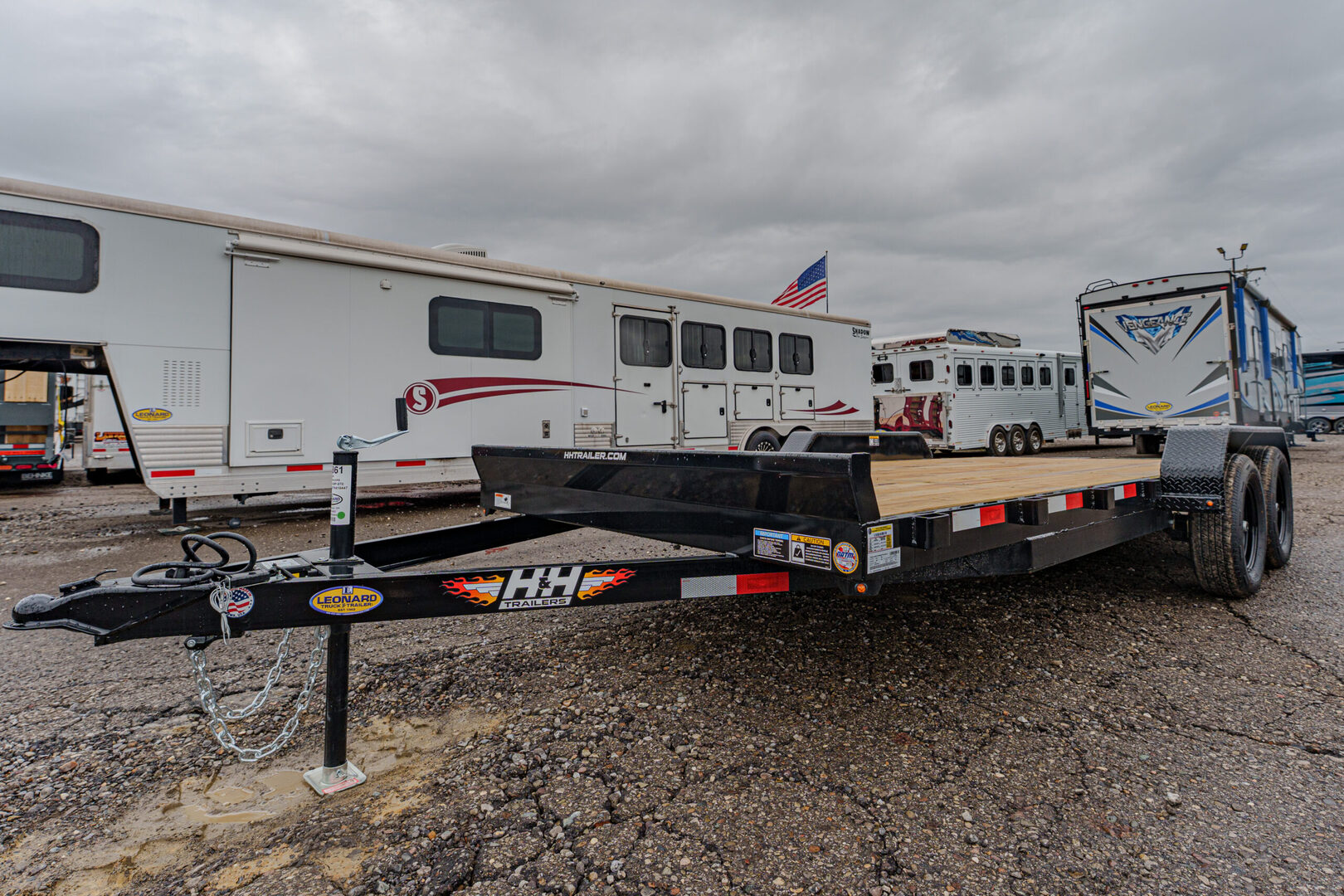 View Inventory: https://leonardtrailers.com/inventory/45859 Stock #45859 – New 2026 H&H 82” x 18’ (16+2) Car Hauler Trailer, 7K Durable and versatile, this 82” x 18’ car hauler is ideal for safely transporting vehicles with ease. Key Specs Size: 82” x 18’ (16’+2’ dovetail) Frame: 5” steel channel Crossmembers: 3” steel channel Tongue: 4” steel channel Coupler: 2-5/16” A-frame, Posi-Lock Axles: 2 x 3,500 lb spring brake w/ easy-lube hubs Jack: 2,000 lb set-back Bulkhead: Heavy-duty tube Deck & Loading 2’ steel tread plate dovetail 3” x 66” steel ladder-style slide-in ramps w/ carrier 2” pressure-treated pine decking w/ board retainers Stake pockets for tie-downs Tires & Wheels ST205/75R15C 6-ply tires 15” 5-hole steel wheels Features & Accessories Double break tread plate fenders DOT-compliant breakaway system (battery, switch, lanyard) Sealed wiring harness w/ 7-pin round plug Full LED exterior lights Spare tire carrier Industrial grade polymer exterior finish Limited 3-year warranty Color: Black A reliable 7K car hauler built for vehicle transport with practical, heavy-duty features. We offer outstanding financing options, accept trades, and can arrange nationwide NO HASSLE delivery! Inquire today at (888) 333-6613. We believe these specifications to be accurate. Any discrepancies are unintentional. Please verify all information with a sales associate prior to purchase. Stock Number:45859