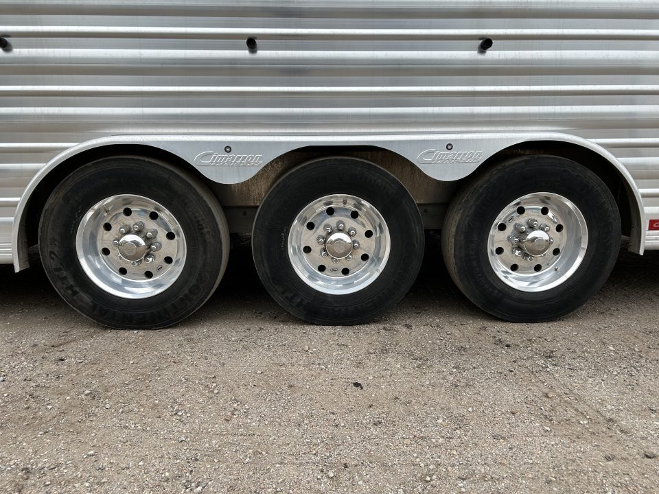 2023 CIMARRON 8 HORSE TRAINER TRAILER 36’-9” BOX LENGTH 8’ WIDE 7’10” TALL 9’ GOOSENECK LENGTH 53” GN DROPWALL (FOR EXTREME 4X4 CLEARANCE) 3- 8K DEXTER AIRFLEX AXLES, 8BOLT HUBS W/ 5/8” STUDS ELECTRIC/HYDRAULIC DISC BRAKES 245/70 R17.5” TIRES ON ALCOA RIMS FULL LENGTH ROCKER PANEL 2 5/16” COUPLER W/POSITIVE LOCK, ADJUSTABLE HEIGHT STEM ENCLOSED UNDER GOOSENECK W/ LOCKING ROLLUP DOOR TEARDROP FENDERS 102” OVERALL WIDTH INSULATED ROOF PANEL HOLDBACKS ON ALL DOORS AND GATES INTEGRATED POD W/ EZ ACCESS LID AND GATE AT REAR EZ ANGLE LADDER LEFT HAND SIDE AT REAR 16 INTERIOR TIE RINGS 16 EXTERIOR TIE RINGS DUAL ELECTRIC/HYDRAULIC JACKS W/ 12V BATTERY AND COMPARTMENT 2 LED PEDESTAL LIGHTS IN REAR 3- 16” LED AWNING LIGHTS PER SIDE SOLID SLANT PARTITION WALL, FULL HEIGHT AND WIDTH REAR BROOM CLOSET RUBBER MAT FLOOR / CARPET GOOSENECK AND DECK IN FT TRIPLE RV BATTERY BOX UNDER GOOSENECK, WIRED HOT SINGLE REAR DOOR W/ PARTIAL WALL (FOR REAR TACK) 32” ACCESS DOOR W/ FEED DOOR AND SBG, LH SIDE WERM FLOOR HEAD SIDE, FOLD DOWN TYPE WINDOWS W/ SAFETY BARS BUTT SIDE, FOLD DOWN TYPE WINDOWS, NO SAFETY BARS FULL WIDTH REAR RAMP OVER REAR DOORS, 52” LONG, SPRING ASSIST 1 FULL TYPE DIVIDER, BARS W/ EXTENDED BARS 7 PARTIAL DIVIDERS, BAR TYPE BAR TYPE HEAD GRILLS, FOR MANGERS MANGER ASSEMBLY 18”W, 7 STALLS, 7 DOORS AND COMP. LIGHTS 1 CHEST BAR 1 BUTT STRAP KICK MAT 48” HIGH LH SIDE, 54” HIGH RH SIDE 2 BRUSH TRAYS 1 CLOTHES BAR 4 POP UP VENTS 9 SADDLE RACKS 2- 6 BLANKET POLES ON GAS SHOCKS 12”X4’ BOOT BOX, FRONT TACK BOGIE WHEELS IN REAR