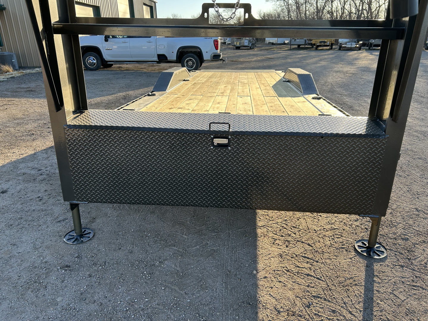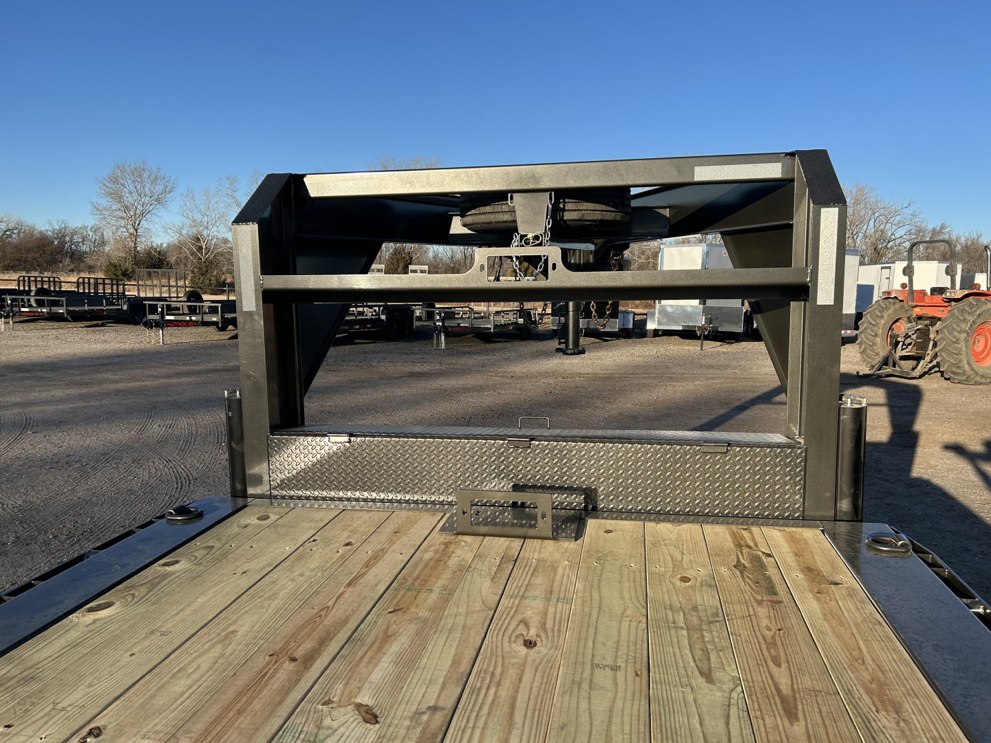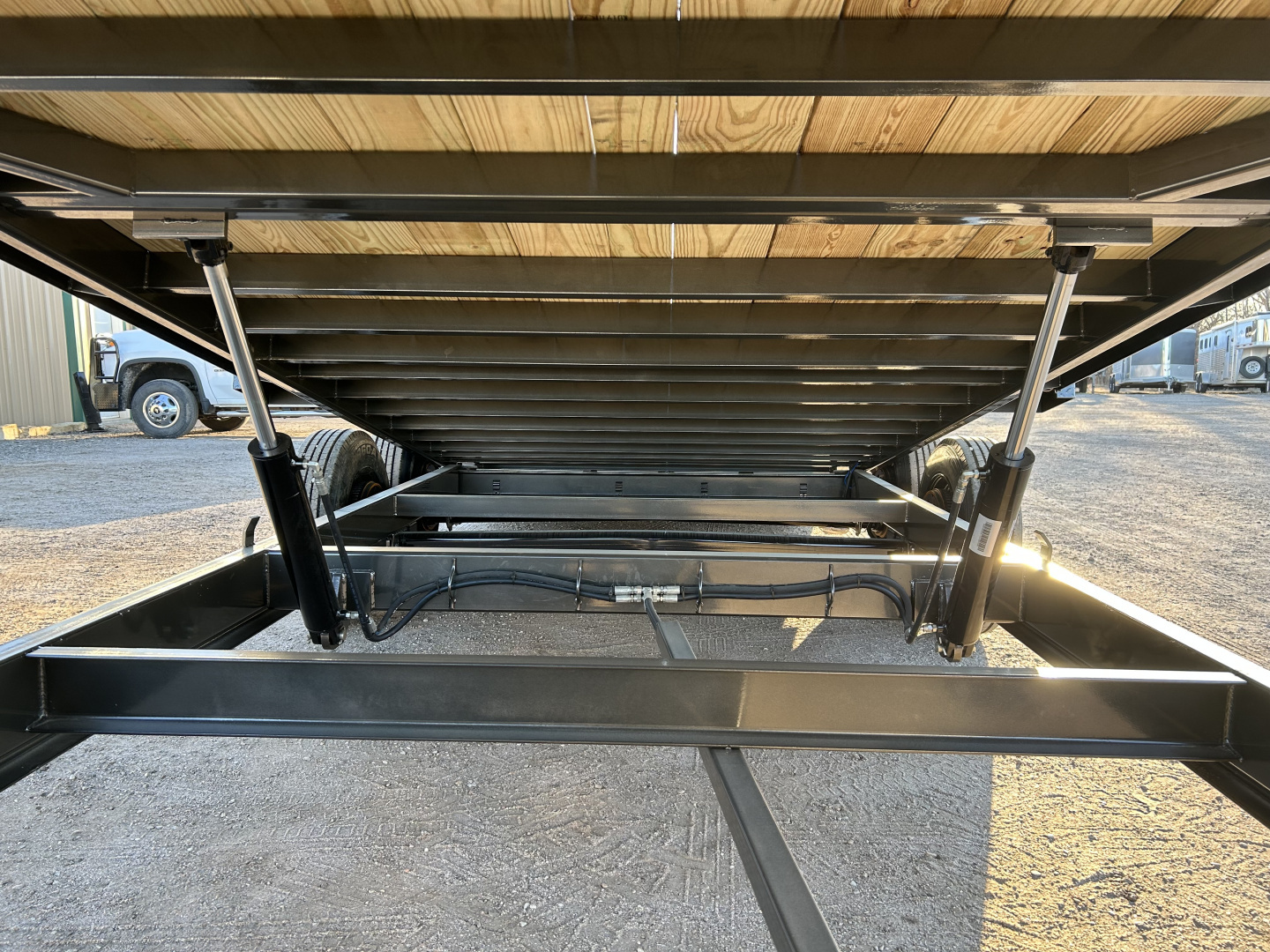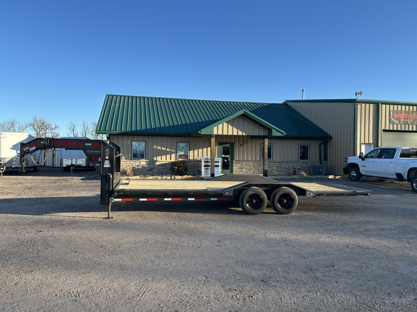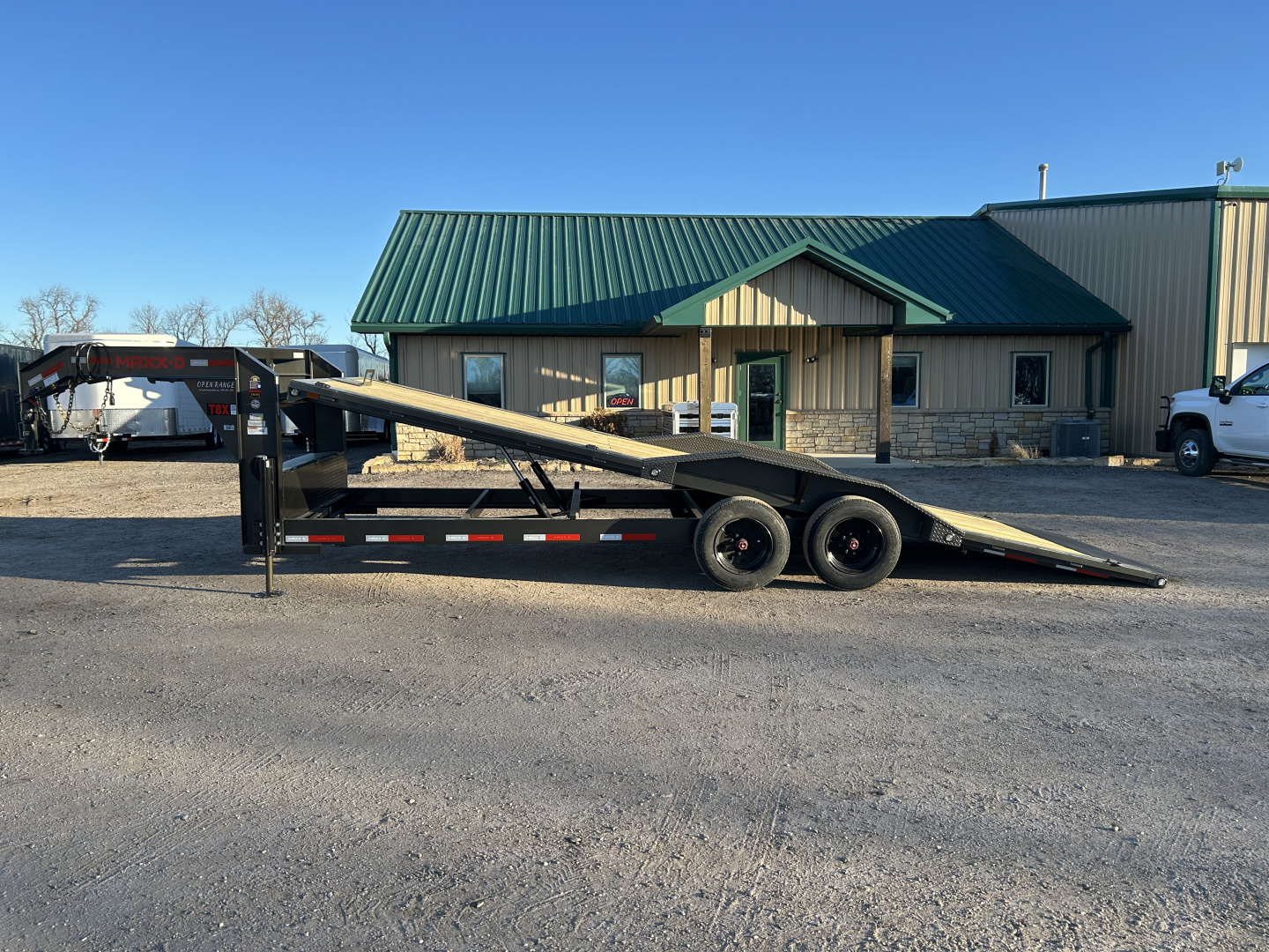 2026 MAXX-D T8X 102”X24’ GOOSENECK POWER TILT TRAILER GVWR 18,000# 2 5/16” 30K GN COUPLER STANDARD HEIGHT I-BEAM NECK W/ FRONT TOOL BOX WINCH PLT, SP MT HYDRAULIC JACKS 6X2 1/4” TUBE FRAME 3” CHANNEL ON 12” CENTER CROSS MEMBERS STAKE POCKETS, RUB RAILS, AND PIPE SPOOLS KNIFE EDGE REAR 8K ELECTRIC BRAKE AXLES TORSION SPRING SUSPENSION ST215/75R 17.5” LR-H TIRES FULL SIZE SPARE DRIVE OVER FENDERS TREATED WOOD FLOOR FLUSHMOUNT LEDS 4X EXTRA 5/8” BULLNOSE D-RING WELDED TO TOP OF SIDE CHANNEL