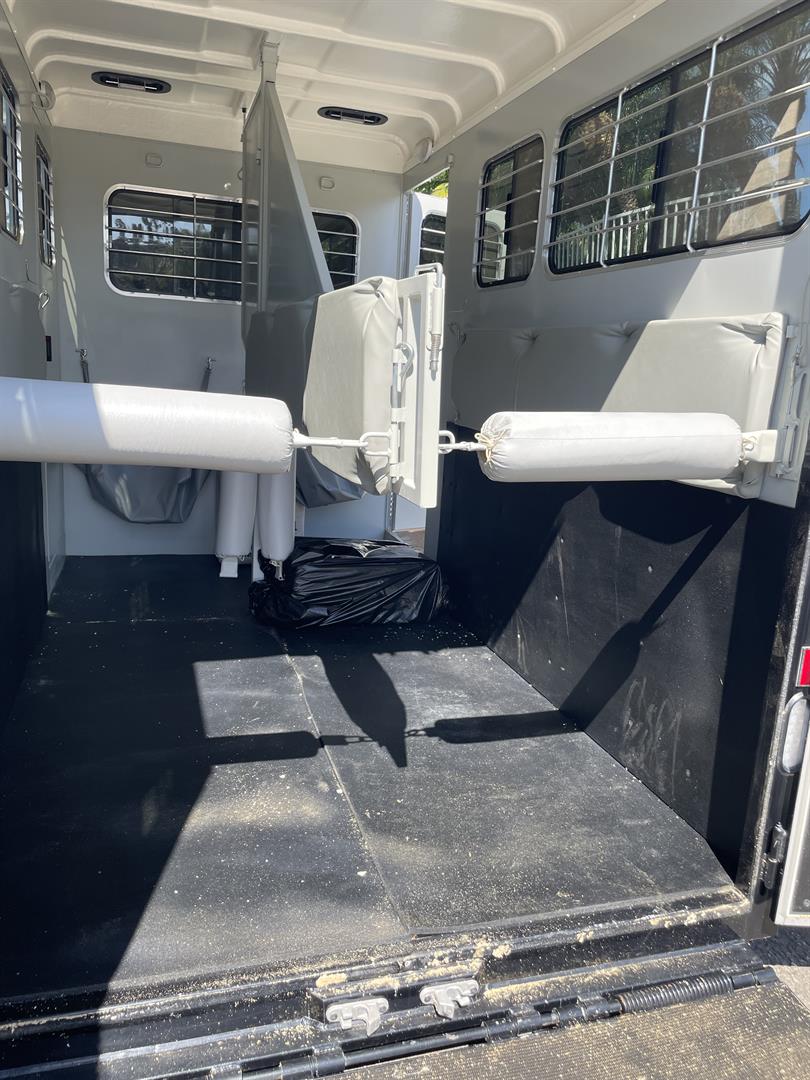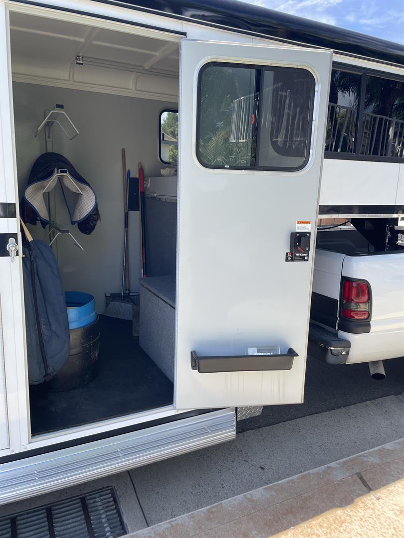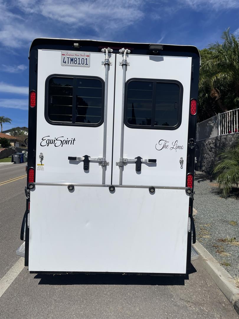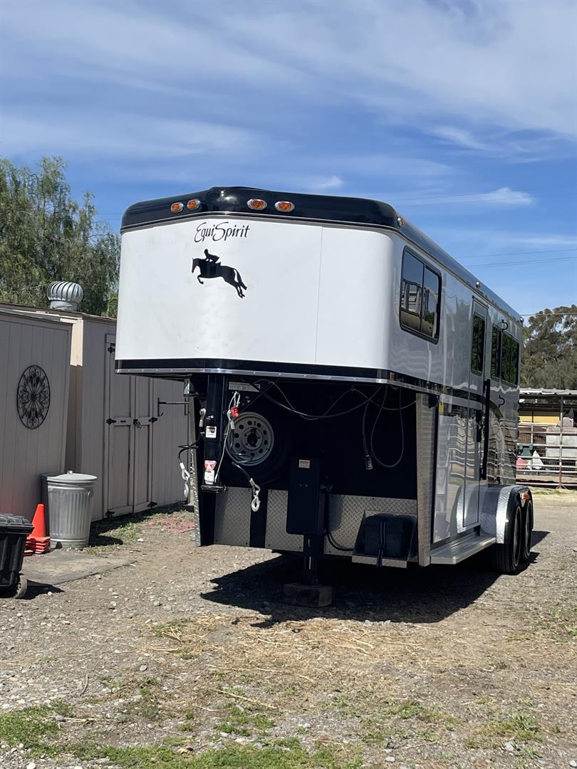 We sold the horse and now it's time to sell this awesome trailer. It is white with black graphics. It is extra tall warmblood size, straight load and very roomy with excellent air flow for your horse's comfort. It has a loading ramp, side doors for handler exit. Easy to clean vinyl hay holders, beautifully padded stalls. 7 ft 8 inches tall interior height and 11 ft long stalls. This trailer comes with a hydraulic jack, new batteries, and plenty of lighting from the loading ramp to the dressing room. Fenders covered with diamond plate their entire length. Dressing room has rubber mat flooring for ease to clean, a clothes bar, extra tack hooks and racks for 3 saddles. Also a large storage bin, a door bin and plenty of room up in the bulkhead over the hitch. Everything is set up with safety in mind for you and your horse. All doors have working locks, hold open devices and all windows work well. The trailer and the trailer tires have always been covered when not in use. Upgraded endurance tires are in excellent condition. The graphics are beautiful and this trailer shows very little wear and tear. We've taken ecellent care of it. Recently serviced so all ready to go to it's next lucky owner. This trailer new is over $38,000. If you are familiar with EquiSpirit, you know they build excellent quality trailers, rated with top safety features. Call me with questions: 619-559-7552