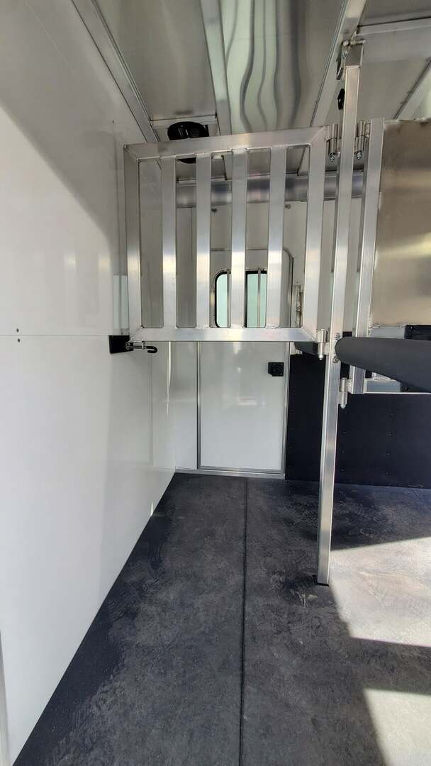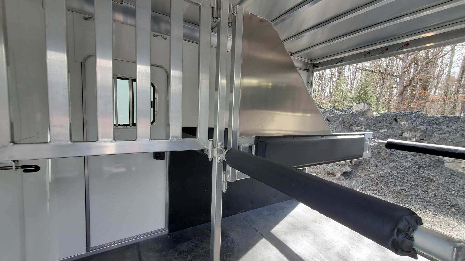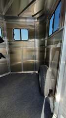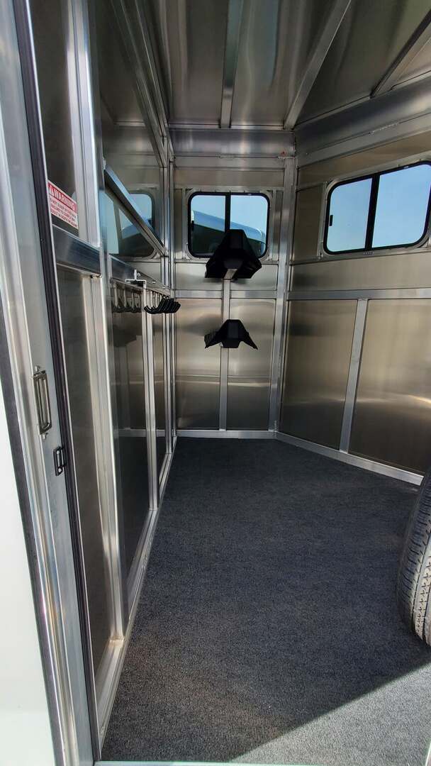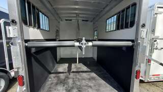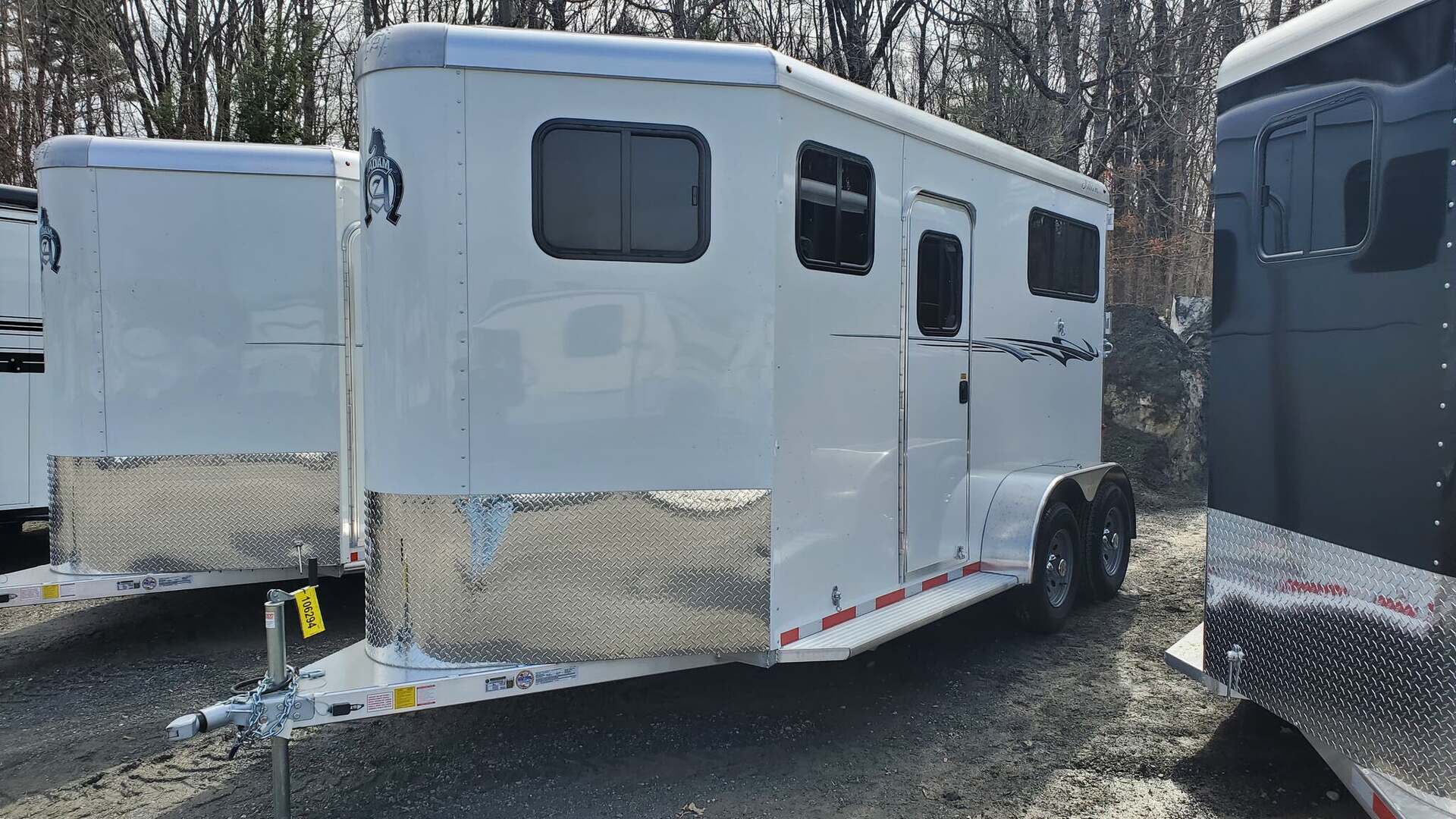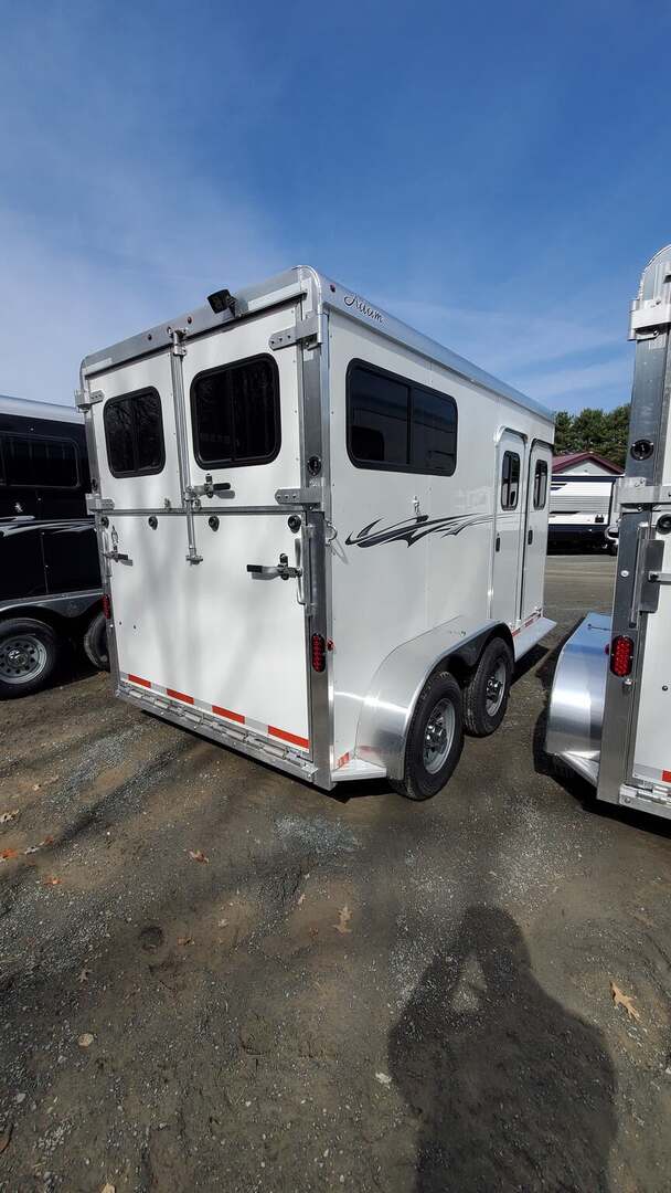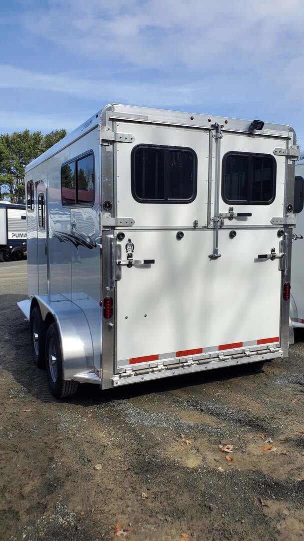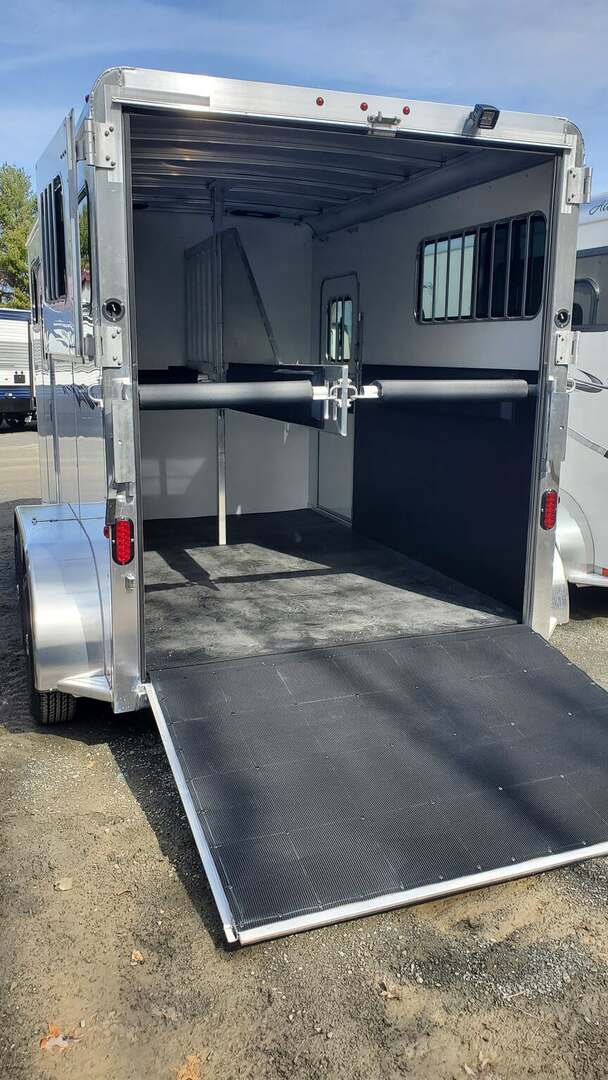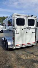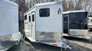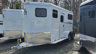 2026 Adam Ju-Lite 2-horse bumper-pull straight-load horse trailer. Amazing value! Safe, rugged, all-aluminum construction with pressure-treated wood flooring. Dexter Torsion Axles. Easy-lift rear ramp. Saddle Racks. Dressing room features deep v-nose design for maximum space. Dual escape doors. White exterior skins. Optional windows in V-nose and in rear curtain doors over ramp. Call today for more information!