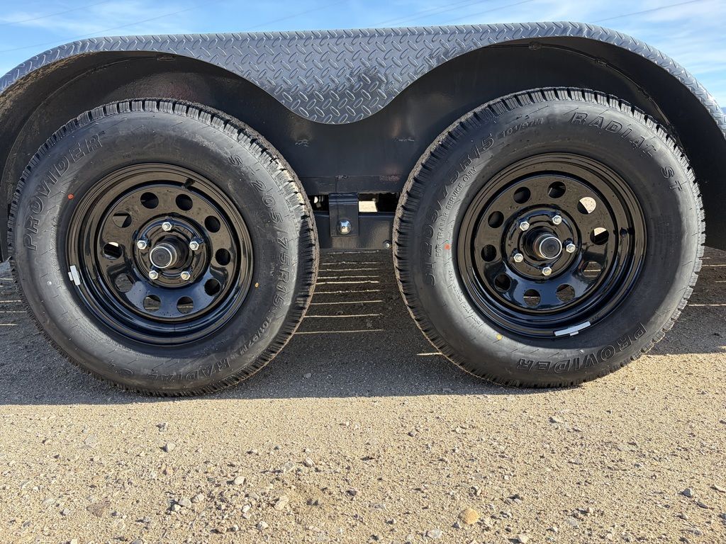 BUMPER PULL3.5K EZ LUBE ELECTRIC BRAKE SPRING AXLE(S)205/75 R15 (C) 6PLY TIRE WITH BLACK WHEEL2” 10K DEMCO ADJ CAST COUPLER2K TOP-WIND FLIP JACKWRAP TONGUE2’ DOVEPAIR OF SLIDE-IN RAMPSROUND DIAMOND PLATE TEARDROP FENDERSSTANDARD STAKE POCKETSFOUR WELD ON D-RINGS5” CHANNEL FRAME24” CENTER-TO-CENTER CROSSMEMBERSRUB RAILTREATED YELLOW PINE FLOORWIRINGLED PACKAGEDECAL PACKAGELAMAR GRAY POWDER COATWeight: 1,905 lbs.