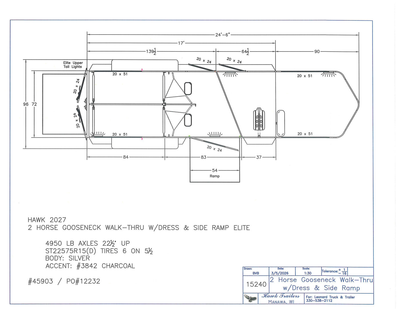View Inventory: https://leonardtrailers.com/inventory/45903 This new 2026 Hawk 2-horse bumper pull trailer is all aluminum with a galvanized steel frame. The horse area is rubber-lined with padded straight load stall dividers and padding on sidewalls. It also has feed bags per stall, vents, lights and 2 escape doors. The dress in this unit is carpeted with a saddle rack, brush tray and a window. Other features include 21’6” length, 72” width, 4950lb axles, spare tire included. Call for more details! *We believe these specifications to be accurate. Any discrepancies are unintentional. Please verify all information with a sales associate prior to purchasing* Stock Number:45903