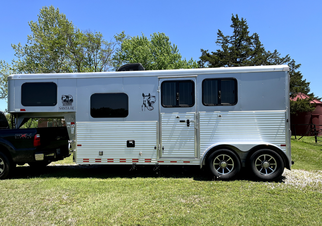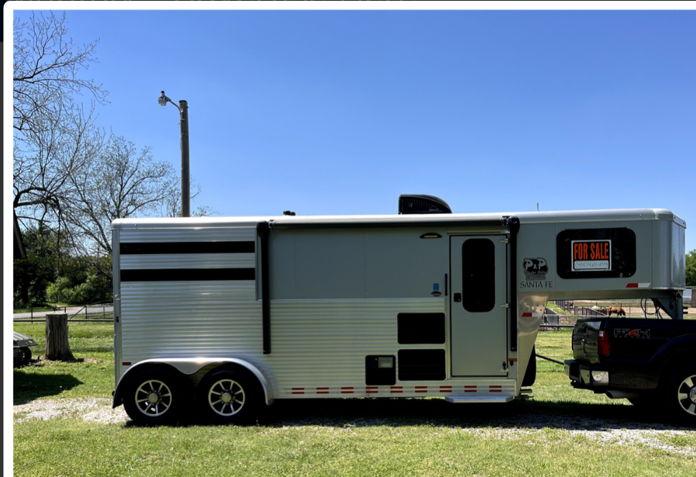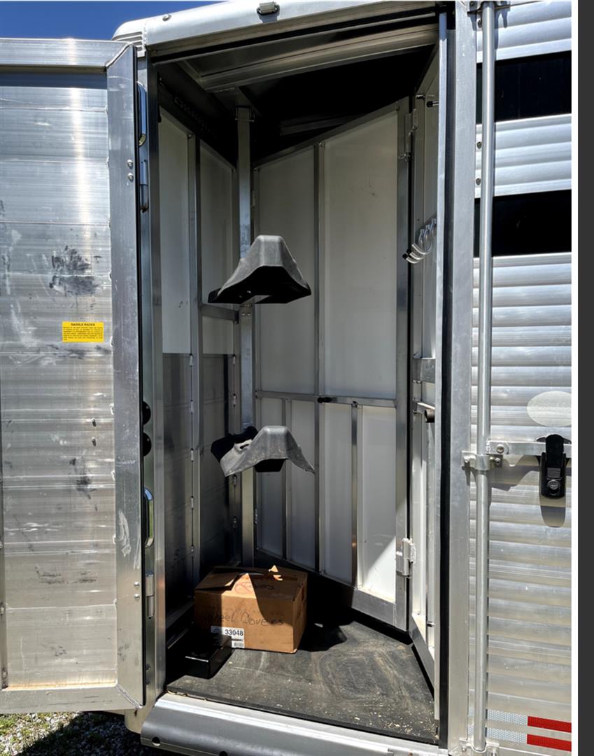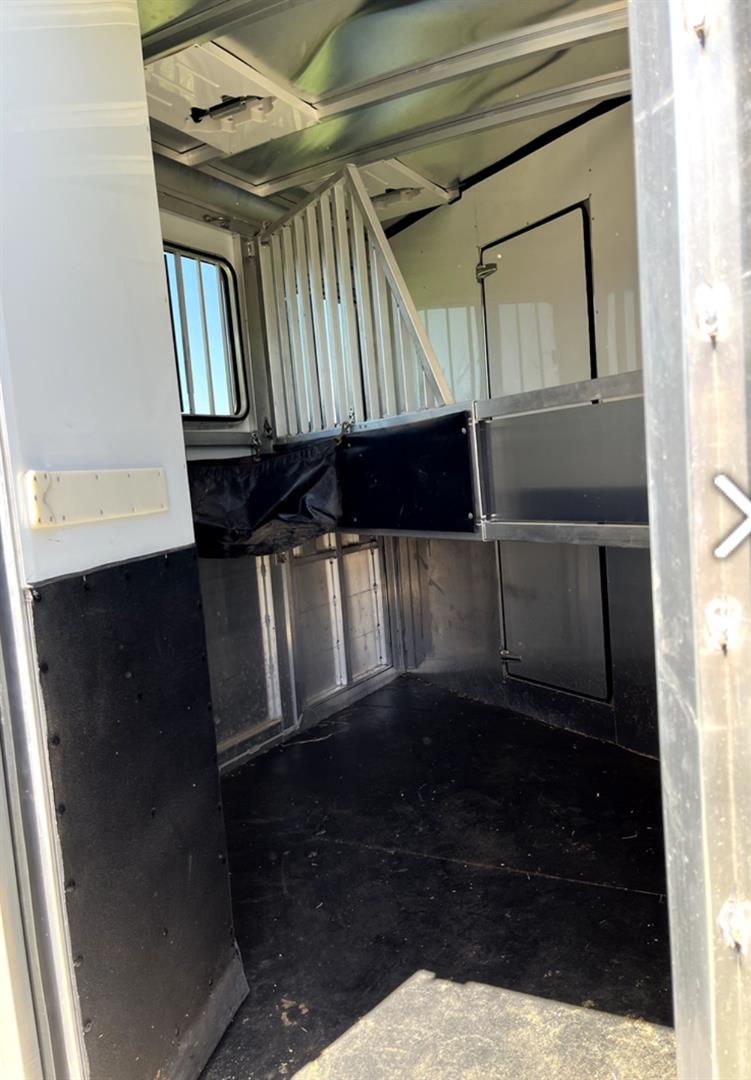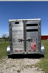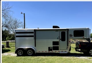 Aluminum trailer in great shape with very little usage. It has 2 horse slant and back tack area. Living quarters area has sink, microwave, refrigerator, pull out couch, bathroom with toilet and shower. Pass through door to stock area. All lights and electronics work great. Room darkening shades to keep you cool in the summer and the air conditioner works great. Trailer has been hauled very little and tires were replaced last summer. Makes a great little trailer to haul for shows or weekend get aways and includes auto canopy for added shade. Trailer has been in covered storage and is in great condition.