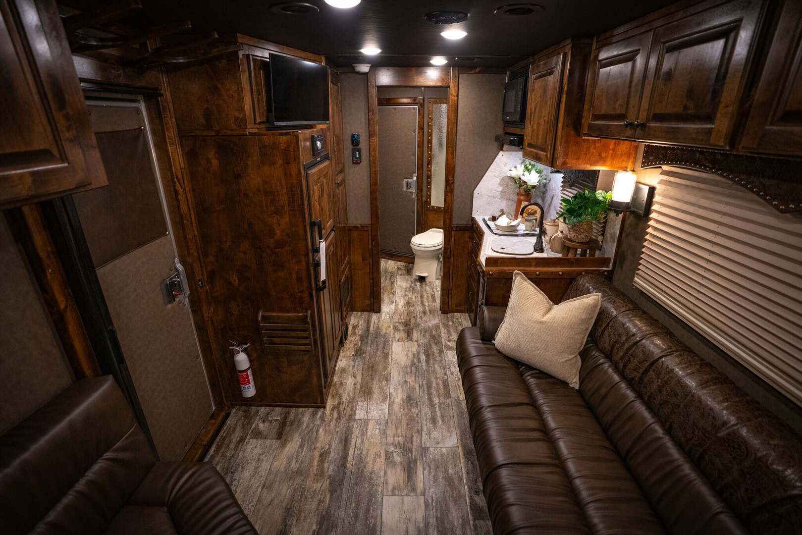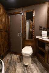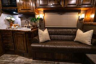 THIS TRAILER IS ON ORDER AND WILL ARRIVE IN AUGUST Platinum Coach 4 horse with 12’ 8” Short wall Outlaw Conversions Select Series SIDE LOAD Outlaw Features: 12’ 8” short wall Dark Knotty Alder raised panel cabinetry Onan 4.0 MicroQuiet generator Hyrdaulic jack 15,000 BTU A/C ducted 20,000 BTU furnace Electric power awning...NICE!!! 6 gallon hot water heater with Propane and 120vAC heat 60 gallon water tank AM/FM/CD/DVD player with 2 interior and 2 exterior speakers 32” LED flat screen on arm 72” sofa sleeper with leather acccent Corner bench with storage below Almond sinks in kitchen and bath 6.0 refrigerator Microwave oven Two burner cooktop Extra wide pocket door to bathroom 32” radius shower with skylight in clear glass Porcelain toilet with foot flush Platinum Coach features: 8 wide x 32’ long x 7’6” tall Full width rear tack, side load 3 mangers with escape door at head Drop down window bars on head side Drop down windows on curb side 6’ hay pod 24” walk through door Baby panel on first divider 2” Blocked axles for additional ground clearance 4 outside halogen load lights 4 tier swing out blanket bar 8,000# axles 14 ply Hankook tires on Mag Aluminum wheels