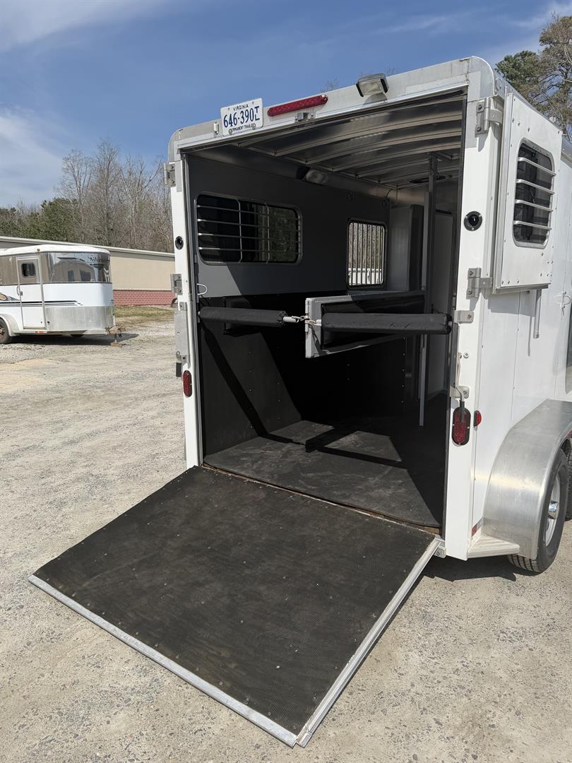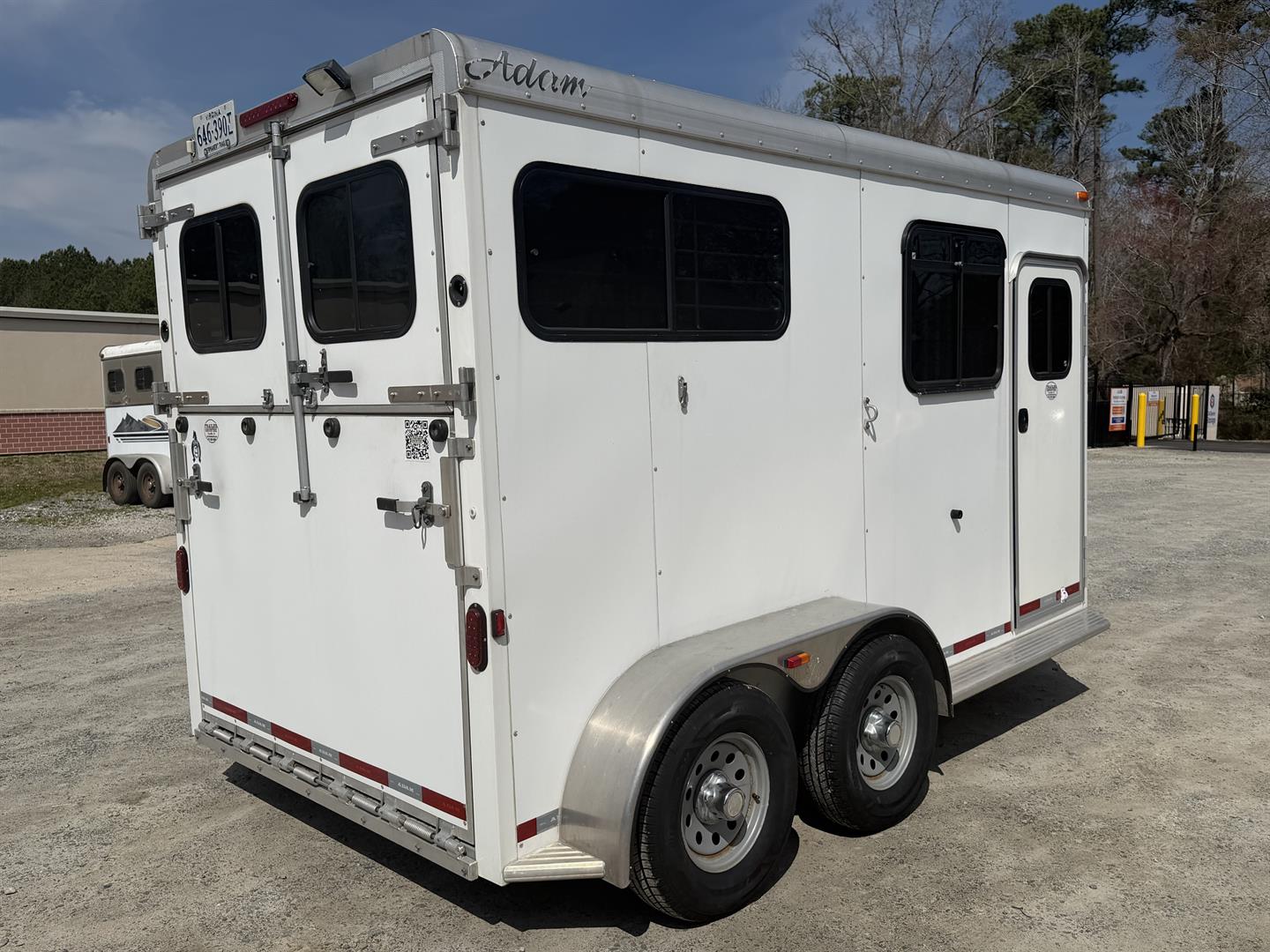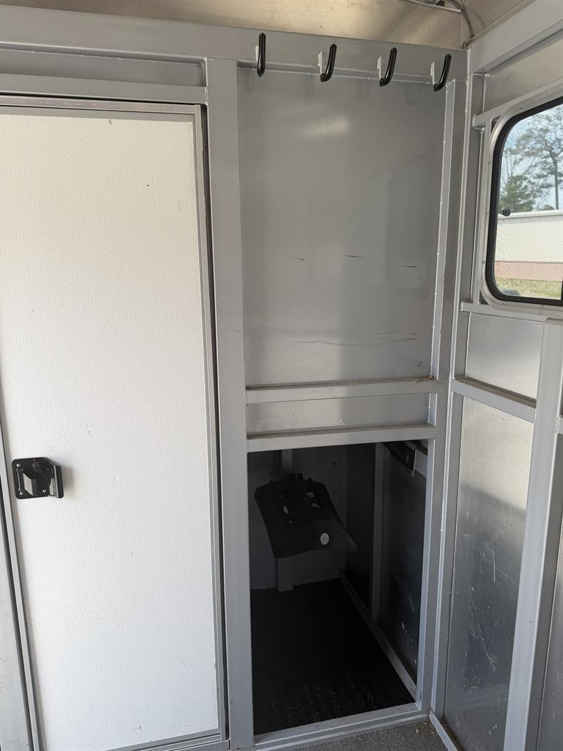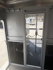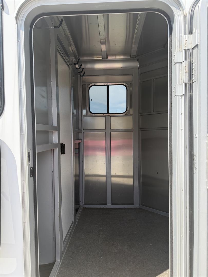 - 4′ dressing room has ample floor space with the saddle racks tucked under the mangers; bridle hooks, spare tire mounted in dresser, walk through door from horse area to dressing room, camper door with screen door