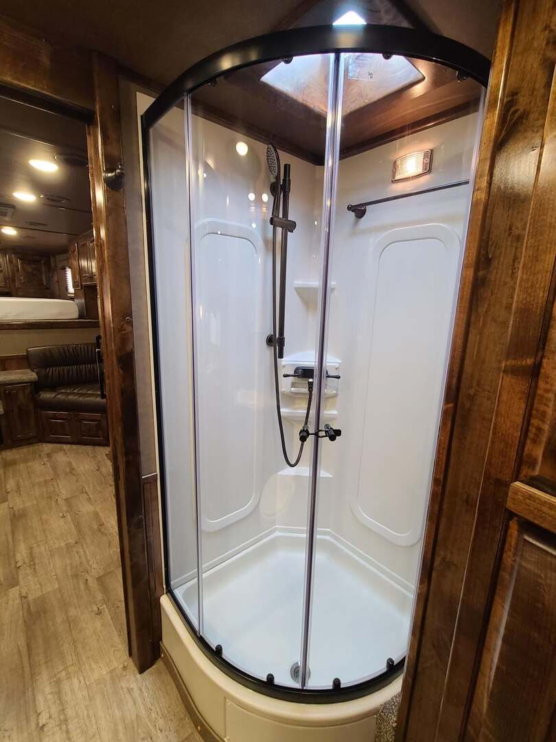 THIS TRAILER IS ON ORDER AND WILL ARRIVE IN AUGUST Platinum Coach 4 horse with 12’ 8” Short wall Outlaw Conversions Select Series SIDE LOAD Outlaw Features: 12’ 8” short wall Dark Knotty Alder raised panel cabinetry Onan 4.0 MicroQuiet generator Hyrdaulic jack 15,000 BTU A/C ducted 20,000 BTU furnace Electric power awning...NICE!!! 6 gallon hot water heater with Propane and 120vAC heat 60 gallon water tank AM/FM/CD/DVD player with 2 interior and 2 exterior speakers 32” LED flat screen on arm 72” sofa sleeper with leather acccent Corner bench with storage below Almond sinks in kitchen and bath 6.0 refrigerator Microwave oven Two burner cooktop Extra wide pocket door to bathroom 32” radius shower with skylight in clear glass Porcelain toilet with foot flush Platinum Coach features: 8 wide x 32’ long x 7’6” tall Full width rear tack, side load 3 mangers with escape door at head Drop down window bars on head side Drop down windows on curb side 6’ hay pod 24” walk through door Baby panel on first divider 2” Blocked axles for additional ground clearance 4 outside halogen load lights 4 tier swing out blanket bar 8,000# axles 14 ply Hankook tires on Mag Aluminum wheels