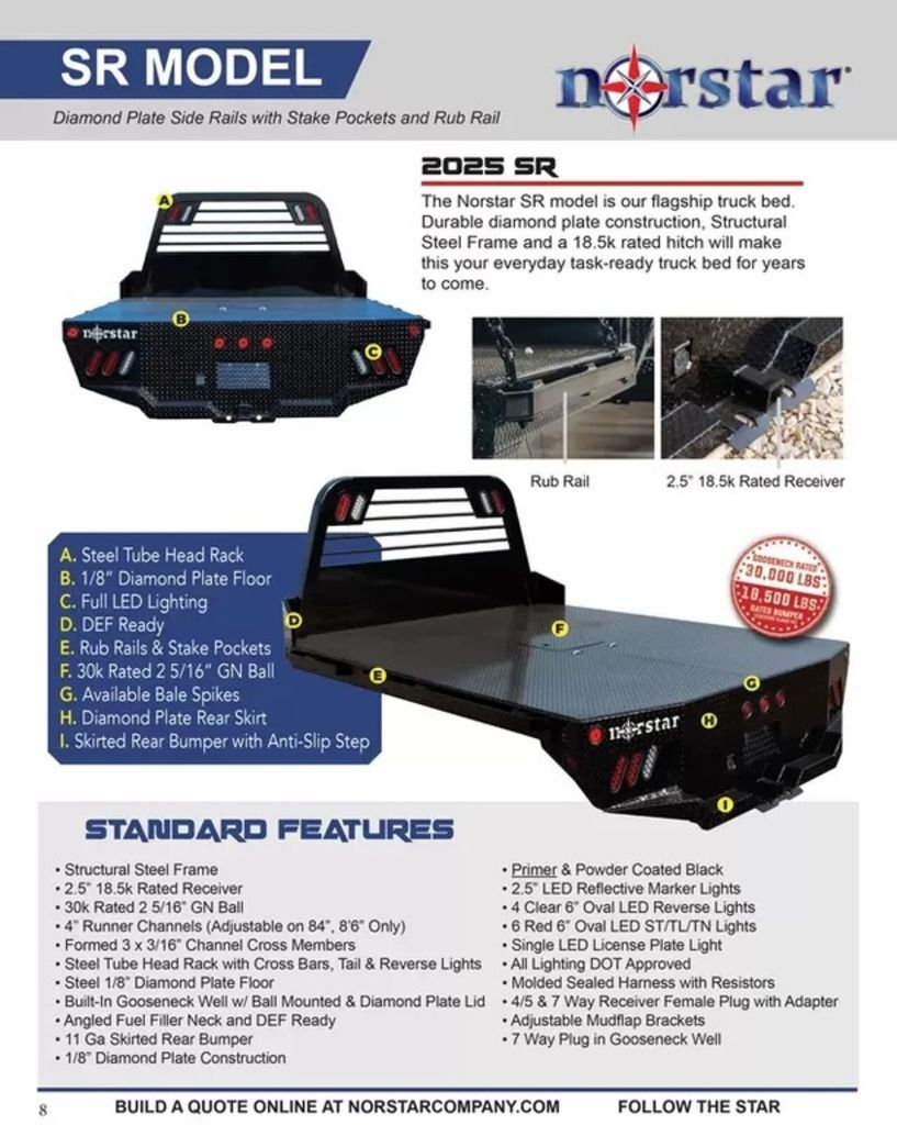 Connecticut Trailers features the following options for this Norstar Truck Bed: • SR 84|84|40 2026 Norstar SR 84” x 84”One of our best sellers - and for good reason. The Norstar SR model offers everything you need in a flatbed configuration. If you want a little more from this basic configuration, look over our options list. We have underbody locking tool boxes for additional storage and gooseneck troughs for a towing upgrade, spare tire mounts for the unexpected and a list of other options to personalize your bed for your home or business needs.The standard 2.5” receiver allows you to add a hitch for bumper pull cargo and a 2 5/16” gooseneck ball is standard in case you are hauling a heavyweight. Our receivers are lab tested and certified for 18,500 lbs bumper capacity and 30,000 lbs gooseneck capacity. Durable diamond plate construction and powder coat will make this bed your most faithful assistant for years to come. Tapered corners, 7 way plug with 4 way adapter and recessed 2 5/16” ball and receiver hitch give you a towing package standard. Exposed stake pockets and rub rail ensure you have tie down points for any load, plus the LED lights are standard on all SRs. Full 11 gauge skirted rear bumpers finish off every model as an additional standard feature.Features may include:Structural Steel Frame2.5” 18.5k Rated Bumper Receiver30k Rated 2 5/16” Gooseneck Ball4” Runner ChannelsFormed 3 x 3/16” Channel Cross MembersSteel Tube Head Rack with Cross Bars, Tail and Reverse LightsSteel 1/8” Diamond Plate FloorBuilt-In Gooseneck Well w/ Ball Mounted and Diamond Plate LidAngled Fuel Filler Neck and DEF Ready1/8” Diamond Plate ConstructionReceiver Hitch Ready7 Way Plug in Gooseneck BoxPowder Coated Black2.5” LED Reflective Marker Lights4 Clear 6” Oval LED Reverse Lights6 Red 6” Oval LED ST/TL/TN LightsSingle LED License Plate LightAll Lighting DOT ApprovedMolded Sealed Harness with Resistors7 Way Receiver Female Plug with ADAPTER11 Ga Skirted Rear BumperAdjustable Mud Flap Brackets
