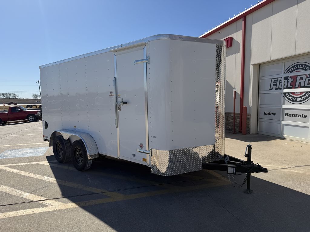 7’ x 16’ Tandem Elite V Nose Cargo 2 x 3,500 lb. EZ Lube 4 in Drop Brake Axles Triple Tongue V Flat Roof System 2 5/16 in Coupler 205 75 R 15 in Radials 2K Jack 30 in Side Door Upgrade w/ Cam Bar and RV Lock ATP Aluminum Fenders 6’ 6 in Interior Height 3/4 in Gray Sealed Painted Floors 3/8 in Plywood Walls Empty Weight: 2,200 lbs. GVWR: 7,000 lbs. Carrying Capacity: 4,800 lbs.