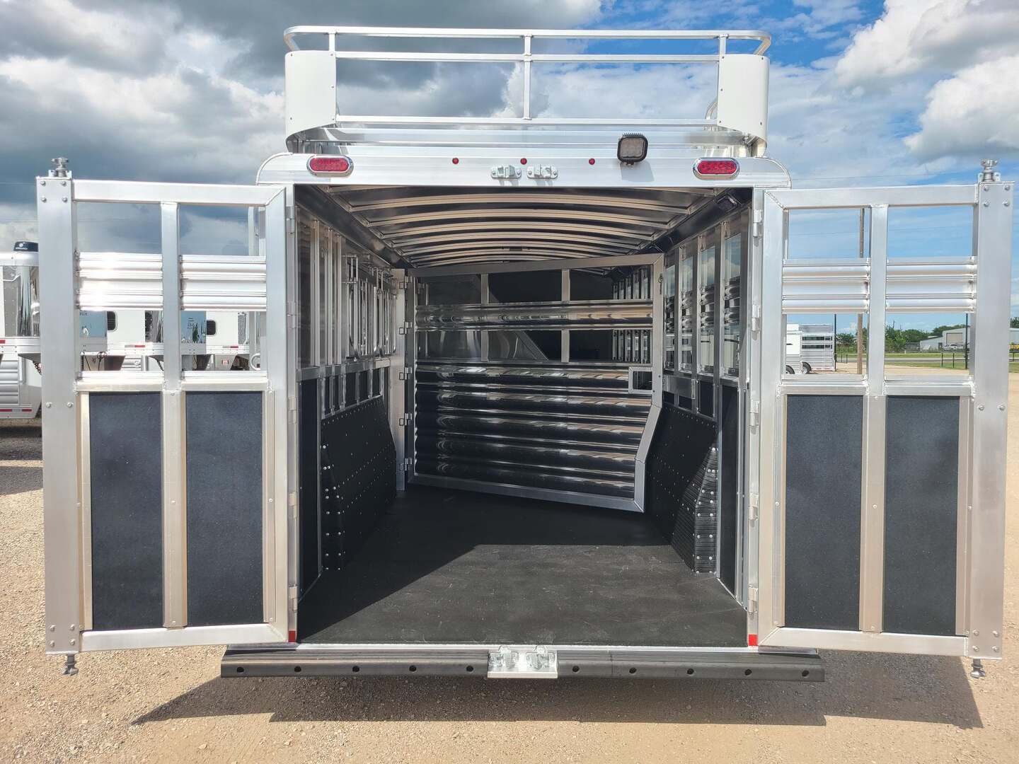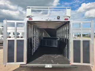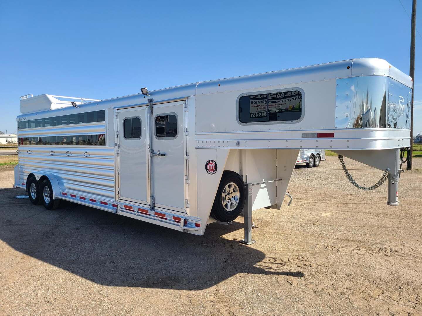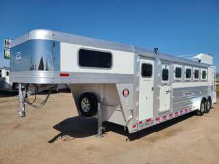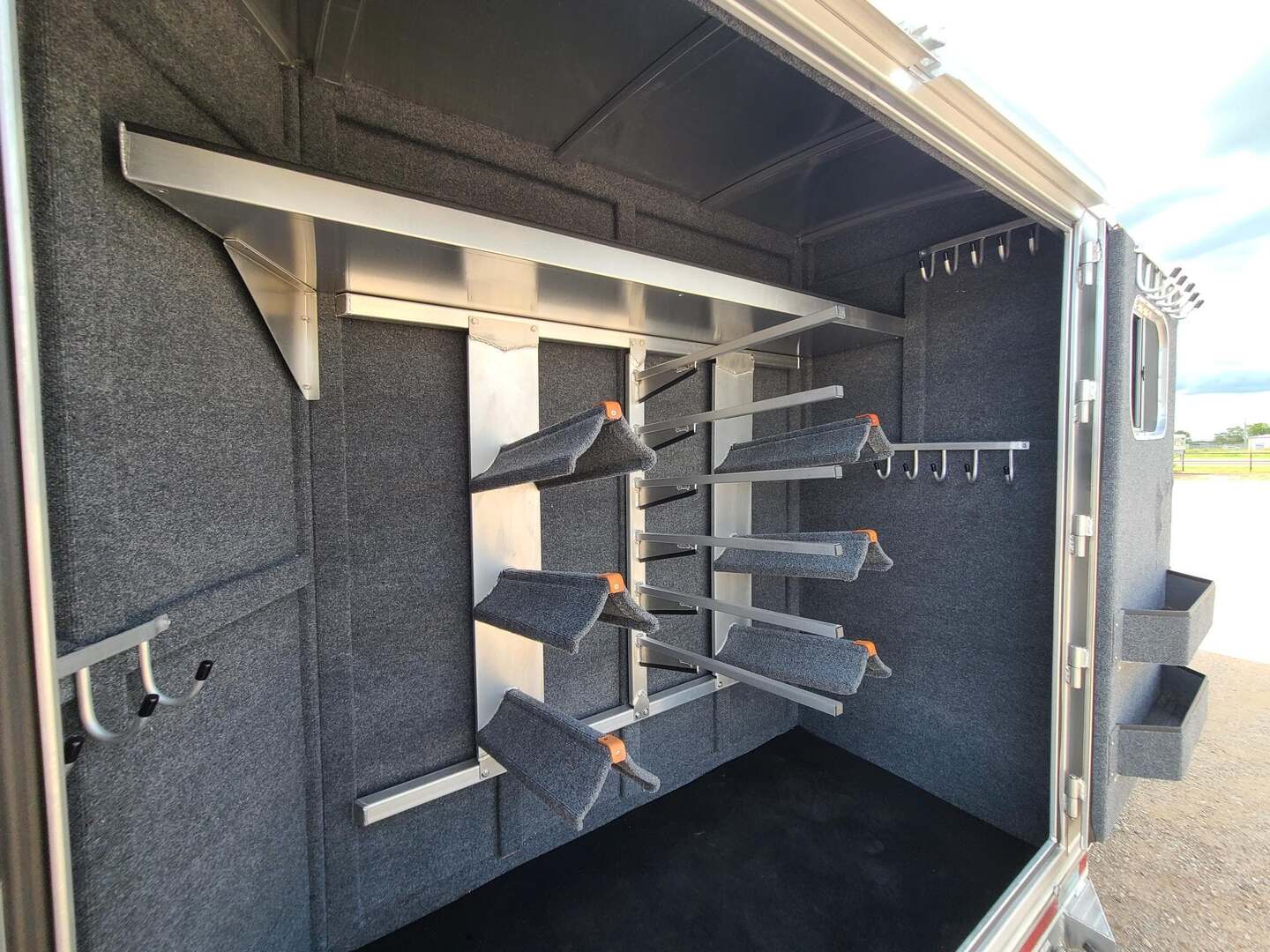 THIS TRAILER IS ON ORDER AND WILL ARRIVE IN APRIL Platinum Coach 5 horse Perfect Trainer / Side Tack!! 7’6” wide x 25’ long x 7 tall Side tack with 6 saddles, 6 bars, 4 brush trays, 30 bridle hooks!!!! Dressing room with boot box, carpet on walls, and hooks on center wall Clothes rod in dressing room nose area, curb side Full width shelf above saddle racks & blanket bars Drop down windows on head side, Plexiglas & track on rump wall Horse divider in first stall with removable baby panel Horse divider on second stall Center gate on third section...haul three behind center gate Glued stall mats on driver and passenger side 3 two-way roof vents in horse compartment...MAX AIR FLOW!! Flow through steps for side tack and dressing room 6’ hay rack 7 round LED clearance lights on top rail 5 LED load lights 7000# axles & 10 ply tires Aluminum 16” wheels Stainless Steel on Nose White Exterior Skin