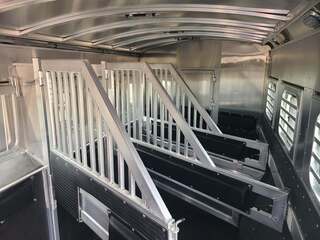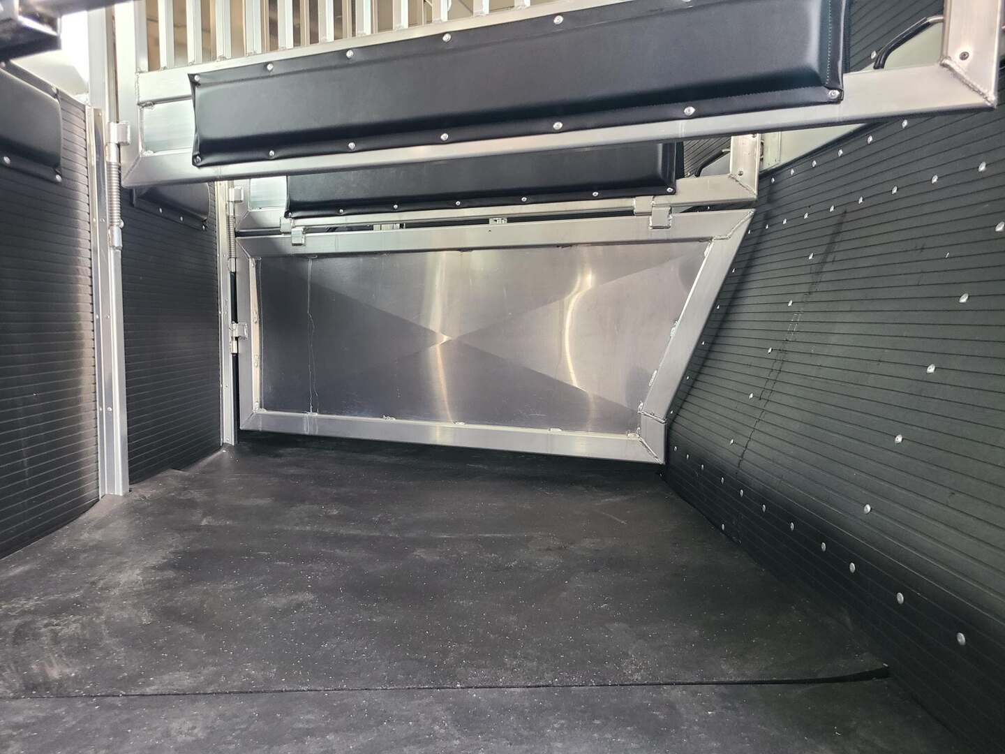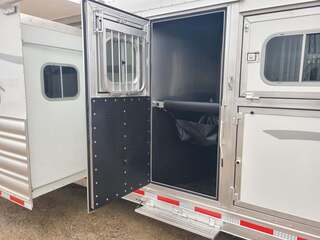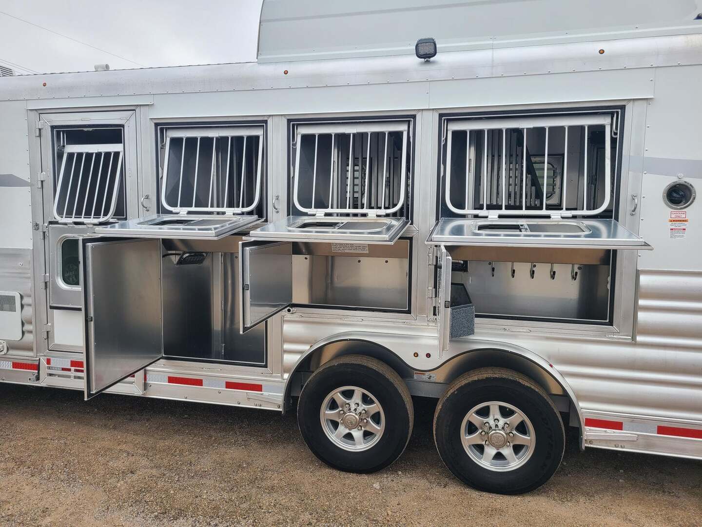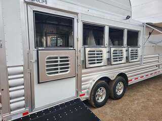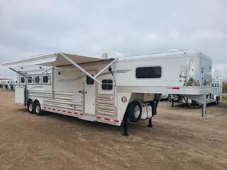 THIS TRAILER IS ON ORDER AND WILL ARRIVE IN SEPTEMBER Platinum Coach 4 horse with 10’ 8” Short wall Outlaw Conversions interior SLIDE OUT with 72” Sofa Sleeper SIDE LOAD Platinum Coach features: 8 wide x 30’ long x 7’6” tall 70/30 Rear Doors & SIDE LOAD 3 mangers with escape door at head Drop down window bars on head side Drop down windows on curb side 6’ hay pod & ladder 24” walk through door Baby panel on first divider 2” Blocked axles for additional ground clearance 4 outside halogen load lights 4 tier swing out blanket bar 8,000# axles 14 ply Goodyear tires mounted on MAG ALUMINUM WHEELS Outlaw Conversions Features: 10’ 8” short wall 72” Sofa Sleeper in 6’ ELECTRIC SLIDE OUT Dual-Hydraulic Jacks Alder Ebony Brio cabinetry Wardrobe in nose Onan 4.0 MicroQuiet generator on platform 15,000 BTU A/C ducted with heat strip 20,000 BTU furnace Electric power awning...NICE!!! 6 gallon hot water heater with Propane heat 60 gallon water tank AM/FM/CD/DVD player with 2 interior and 2 exterior speakers 24” LED flat screen on arm Fiberglass kitchen sink & faucet 2 Hardwood hat racks over R/V door 6.0 refrigerator 2 Burner flush glass cover cooktop w/ venthood Microwave oven Extra wide pocket door to bathroom 32” radius shower w/ bronze glass door & skylight Porcelain toilet with foot flush Mirrors in wardrobe cabinet doors & full length mirror Additional Day/Night Shades
