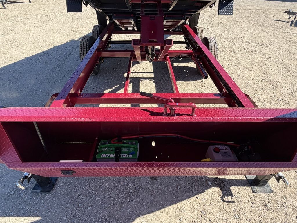 Gooseneck 2 - 7K Lippert Electric Brake EZ Lube Spring Axles ST235/80R16 Tires (10 ply) w/Black Mod Wheels 10 Ply Spare Weld on Spare Tire Mount 2-5/16” Adjustable GN Coupler (30K) 2 - Side Wind Spring Loaded Drop Leg Jacks (12K) Mega Lockable Toolbox Houses Battery & Pump 3 Way Door Gate - Spreader Gate Ramp Pockets w/6’ 4” Long Slide in 4” Channel Ramps 12ga. Diamond Plate Steel Fenders 2’ Sides 4 D-Rings Welded Inside Bed 8” I-Beam Frame Neckboss 10” Engineered I-Beam Tongue 3/8” Grade 70 Safety Chain w/Clevis Hook 3” Channel 16” Spacing Crossmembers 2 Button Hydraulic - Power Up/Gravity Down KTI 12V Hydraulic Pump 1 - Interstate 27 Deep Cycle Battery 110V Integrated Trickle Charger Manual Tarp Kit All-Weather Wiring Harness (7-Way RV) DOT Approved LED Lights Powdercoat Burgundy/Black 7 ga. Steel Bed Weight: 5,630 lbs