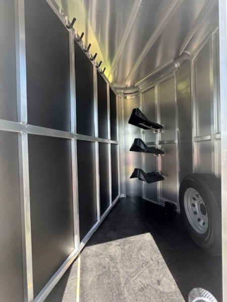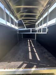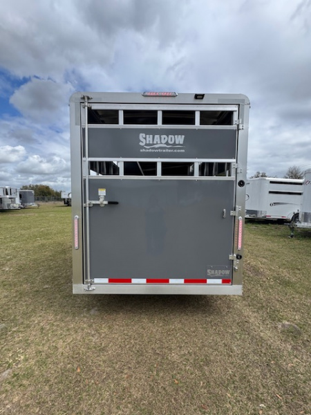 2026 Shadow 3 Horse STK Bumper Pull This trailer is perfect for hauling local or to shows. The stock sides all the way around provide optimal airflow to keep horses cool. The trailer is all aluminum with the exception of the pressure treated wood floor. Horse are has 42" stalls, telescoping dividers, two tie rings per stall, rubber mats and interior lights. Trailer also has a rear load light. Trailer is very versatile as not only is it SUV and small truck friendly the Tack room wall collapses so that it can be a muti use / utility trailer. Tack room has 3 saddle racks, brush box, and (6) bridal hooks along with a matching full size spare tire.