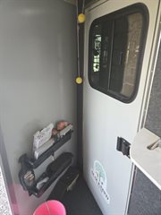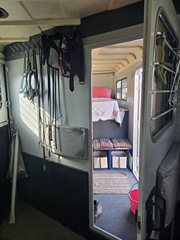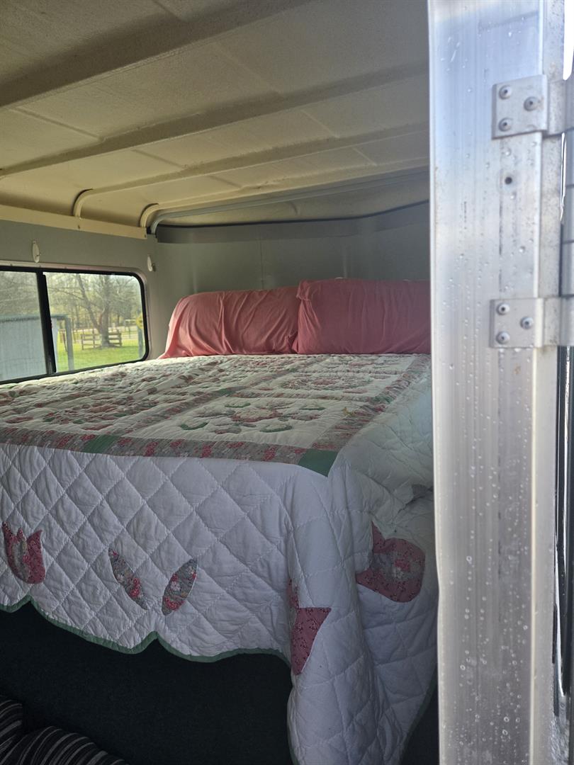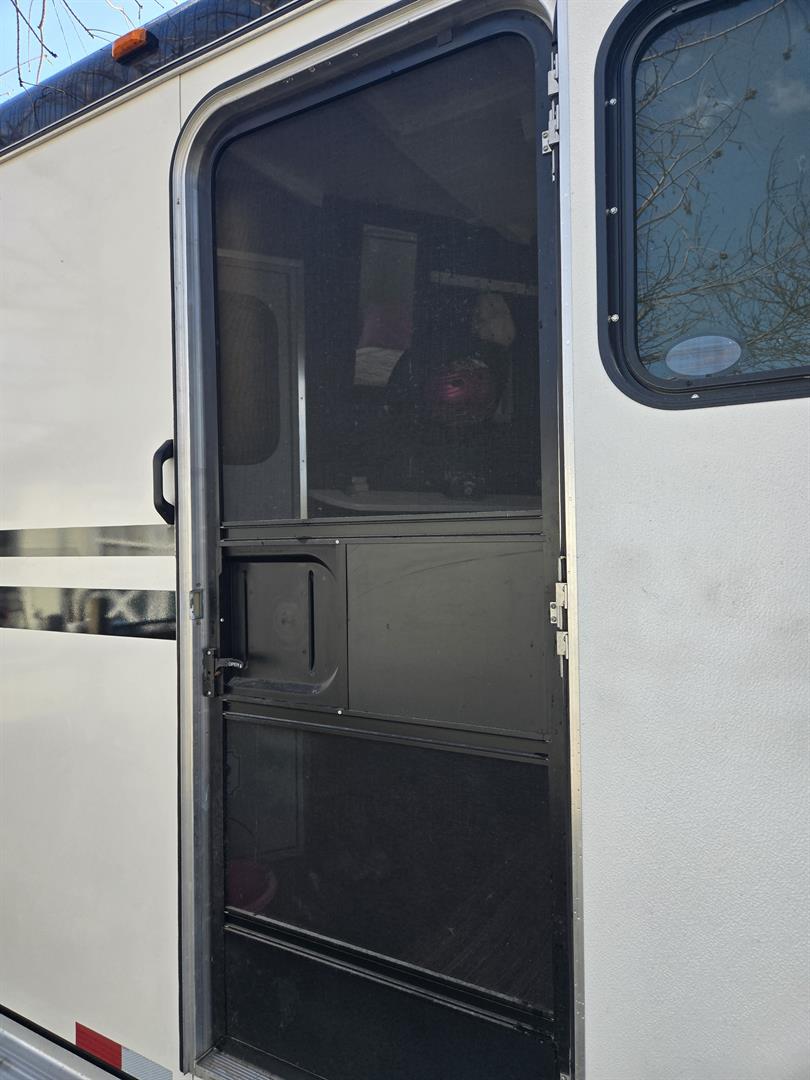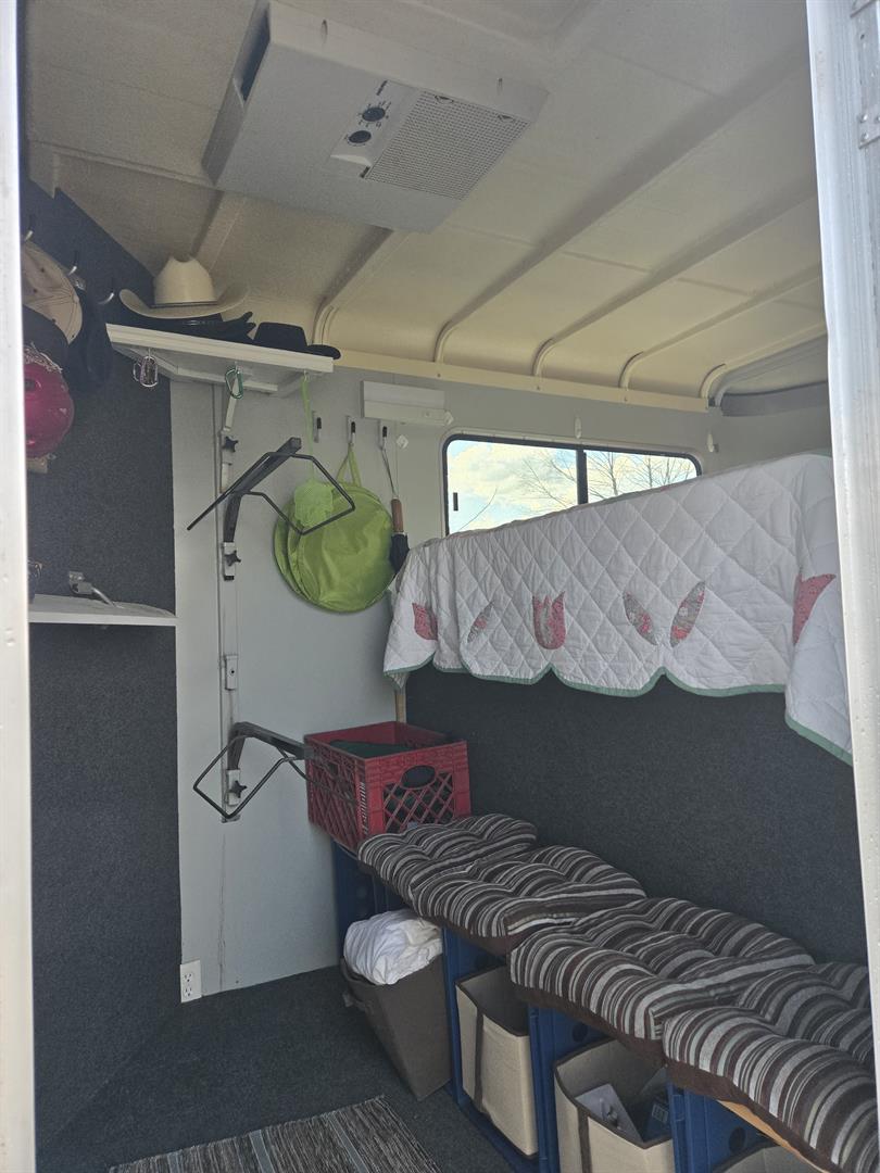 13,500 BTU A/C unit with Heat strip and extra roof support in tack room. Requires 30amp connection to exterior power source. Makes for a great long weekender for overnight stays at the horse show or campground JUst add a mini fridge, coffe pot and microwave and you're set.