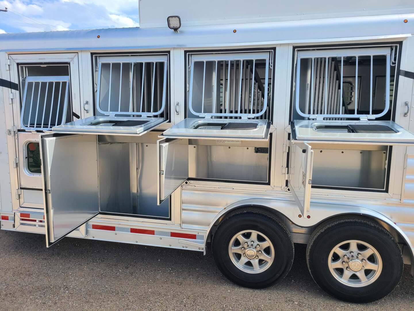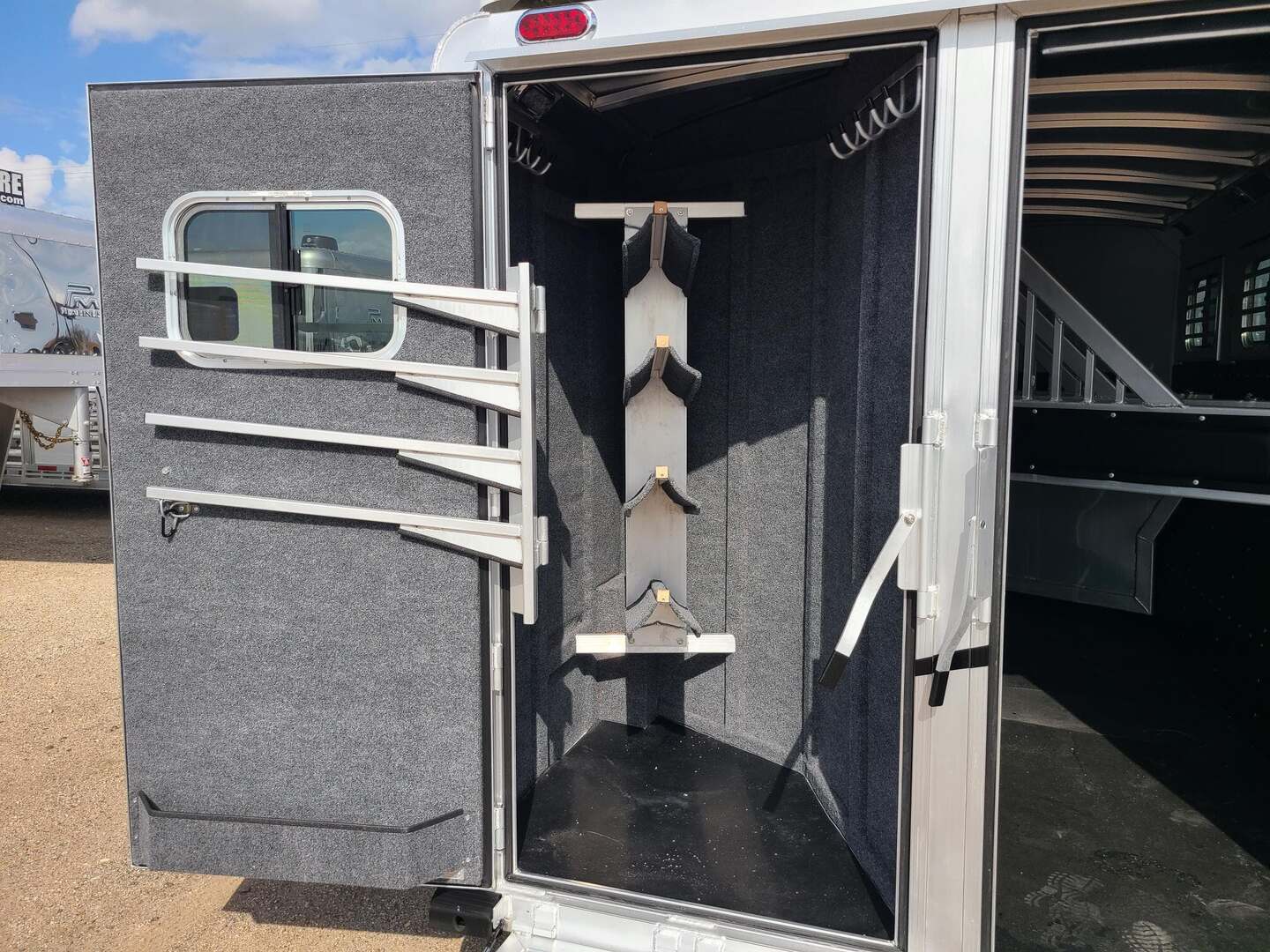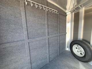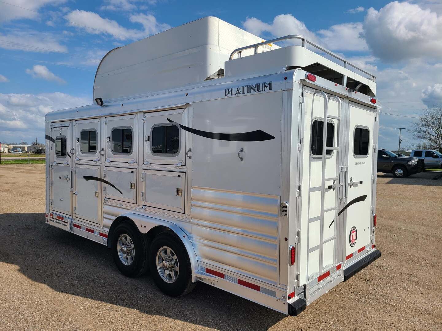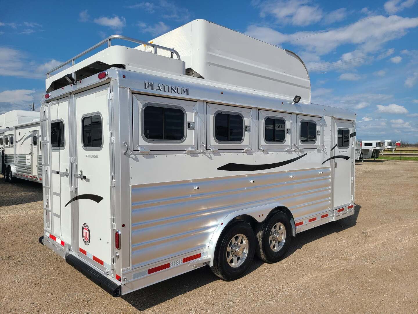 THIS TRAILER IS ON ORDER AND WILL ARRIVE IN MAY Platinum Coach 4 Horse Bumper Pull with Mangers 8’ wide x 7’ tall x 18’ long Extended tongue, pull easier behind motor home!! 3 mangers with escape door at head 7,000# axles Aluminum wheels Drop down window on escape door Drop down window bars Drop down window on passenger side Carpeted and sealed rear tack, keep your tack CLEAN!! Flow through dividers on swinging portion of divider LED load lights on each side, one at back 6’ hay pod and 3’ landing with ladder Bridle hooks in rear tack and carpeted bulkhead wall in dressing room Fold up steps at REAR TACK, dressing room door and escape door