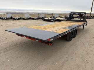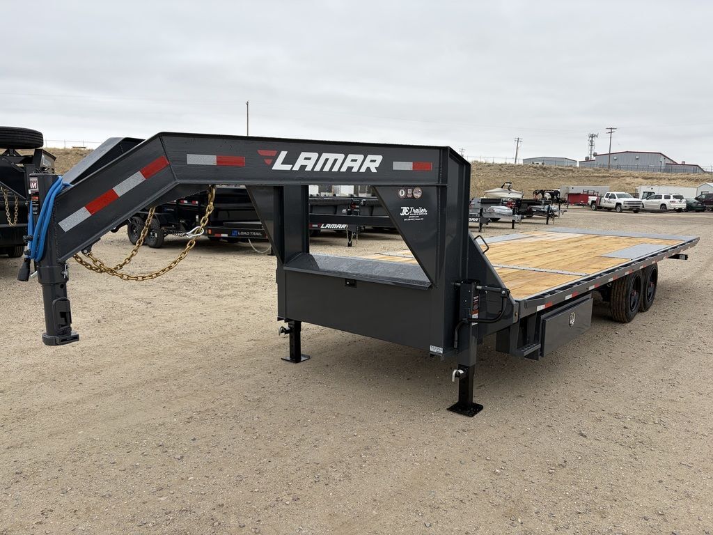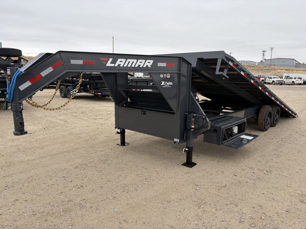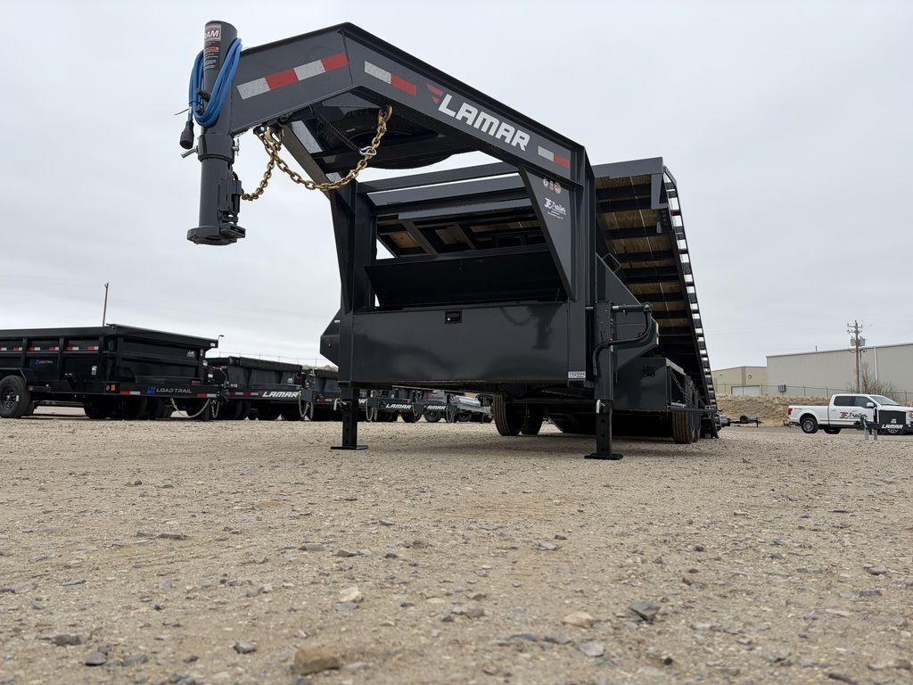 GOOSENECK8K ELECTRIC BRAKE OIL BATH SPRING AXLE(S)215/75 R17.5 (H) 16PLY SS TIRE BLACK WHEELSPARE TIRE2-5/16” 30K GOOSENECK COUPLERREGULAR HEIGHT NECK & COUPLERDUAL 10K DROP-LEG JACKSFRONT TOOL BOXSTANDARD STAKE POCKETS10” 12 LB I-BEAM FRAME16” CENTER-TO-CENTER CROSSMEMBERSRUB RAIL12V DC PUMPDEFAULT REMOTETREATED YELLOW PINE FLOORDECK MOUNT WINCH PLATEWIRINGLED PACKAGE12V DEEP CYCLE BATTERY KITSOLAR CHARGERDECAL PACKAGELAMAR GRAY POWDER COATWeight: 5,750lbs.