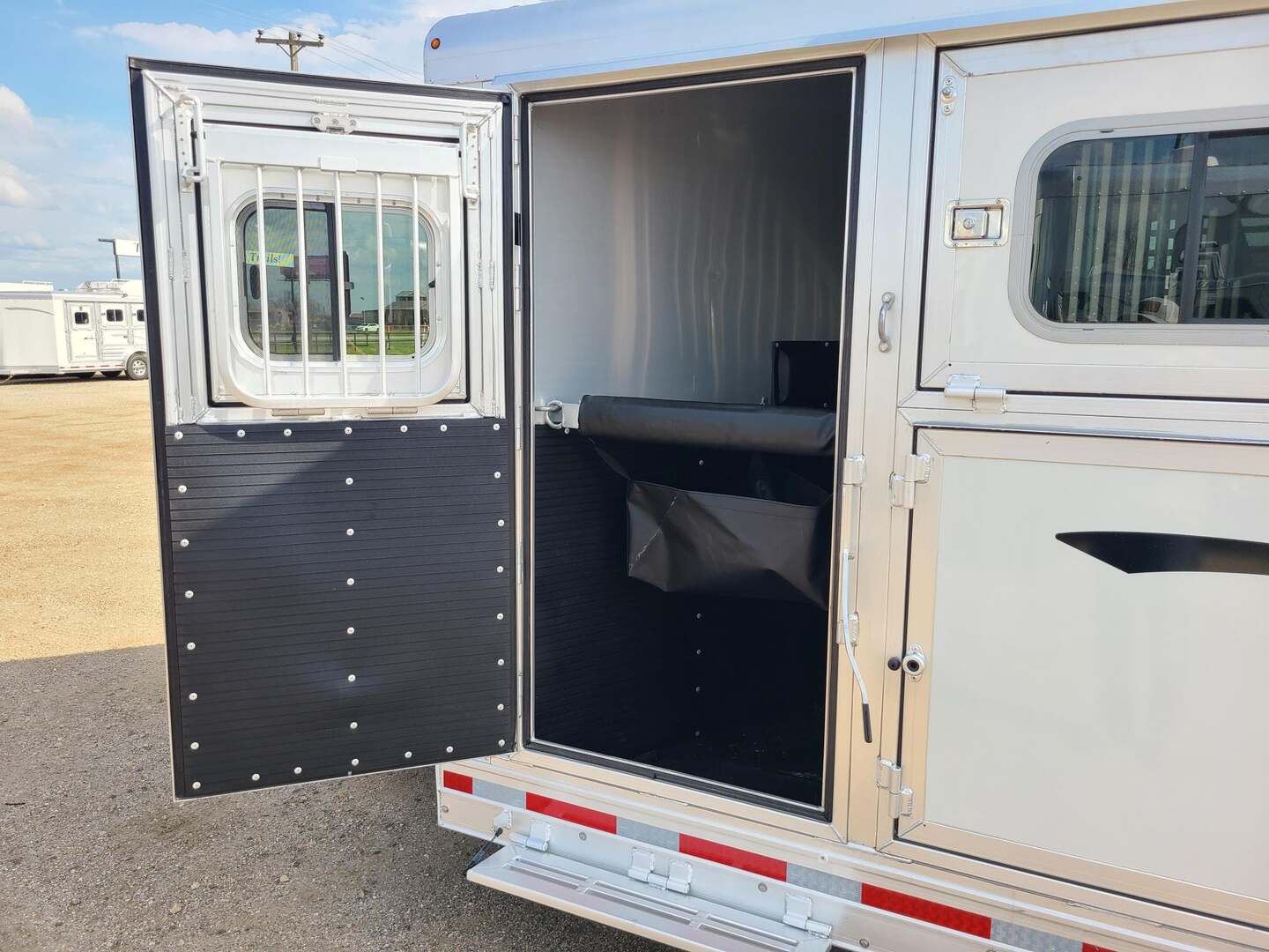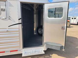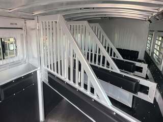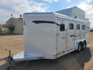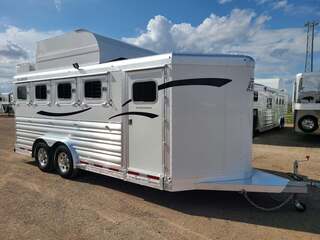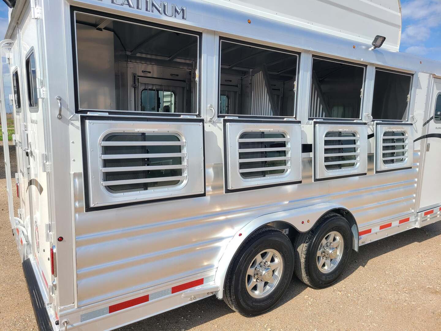 THIS TRAILER IS ON ORDER AND WILL ARRIVE IN MAY Platinum Coach 4 Horse Bumper Pull with Mangers 8’ wide x 7’ tall x 18’ long Extended tongue, pull easier behind motor home!! 3 mangers with escape door at head 7,000# axles Aluminum wheels Drop down window on escape door Drop down window bars Drop down window on passenger side Carpeted and sealed rear tack, keep your tack CLEAN!! Flow through dividers on swinging portion of divider LED load lights on each side, one at back 6’ hay pod and 3’ landing with ladder Bridle hooks in rear tack and carpeted bulkhead wall in dressing room Fold up steps at REAR TACK, dressing room door and escape door