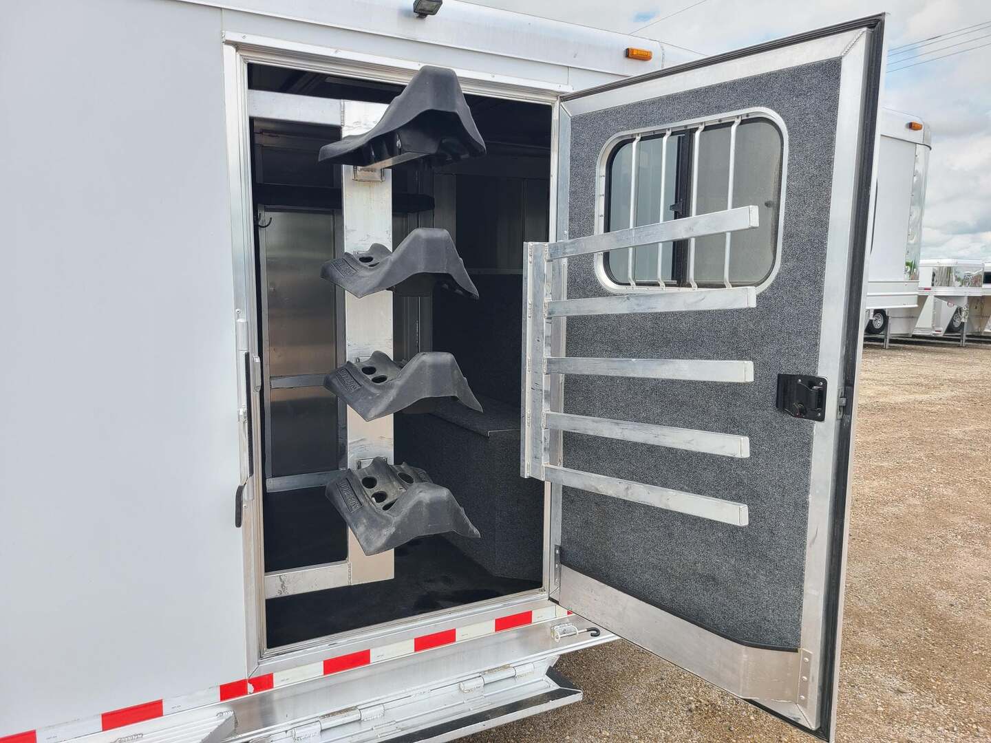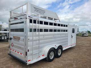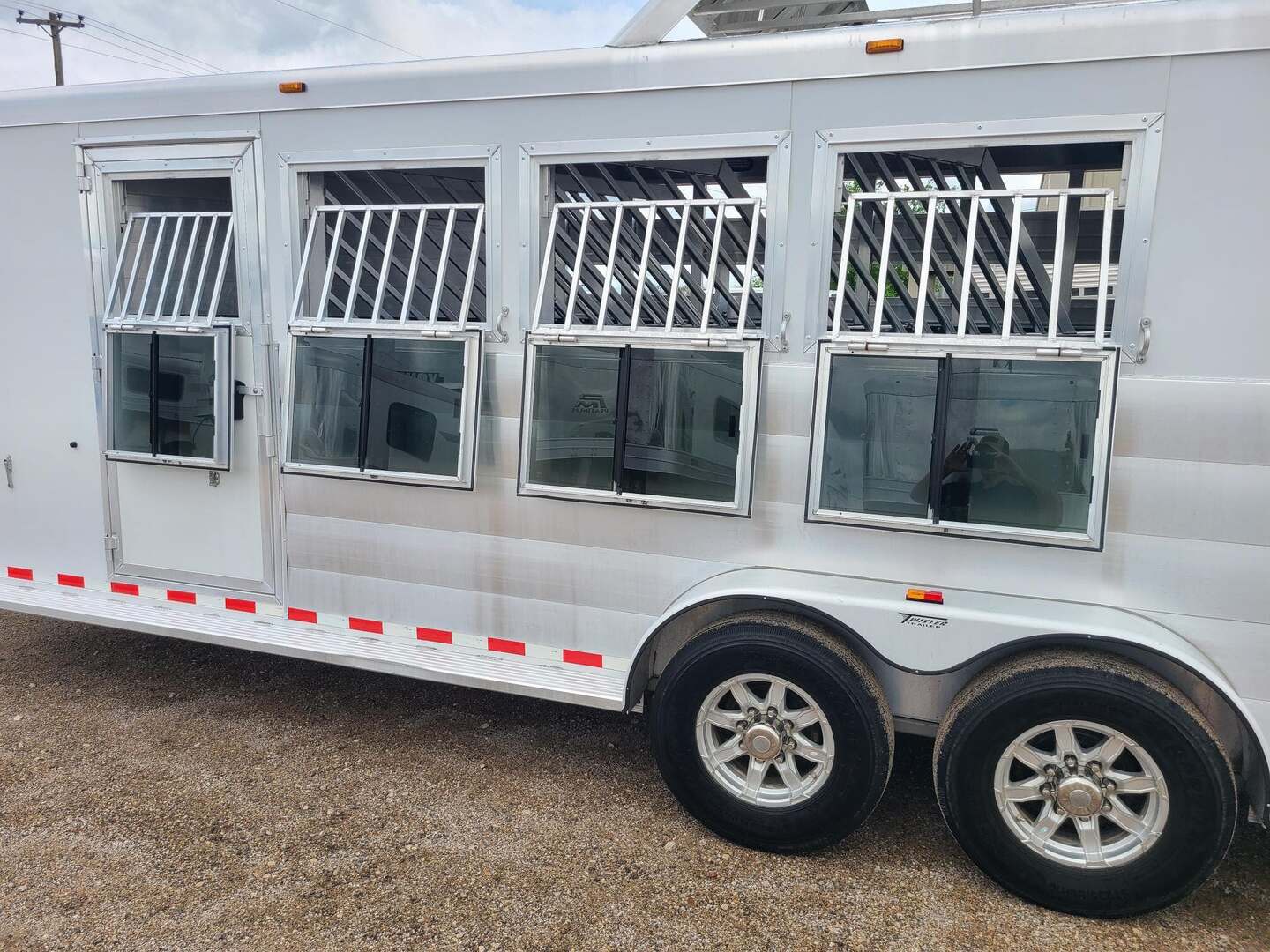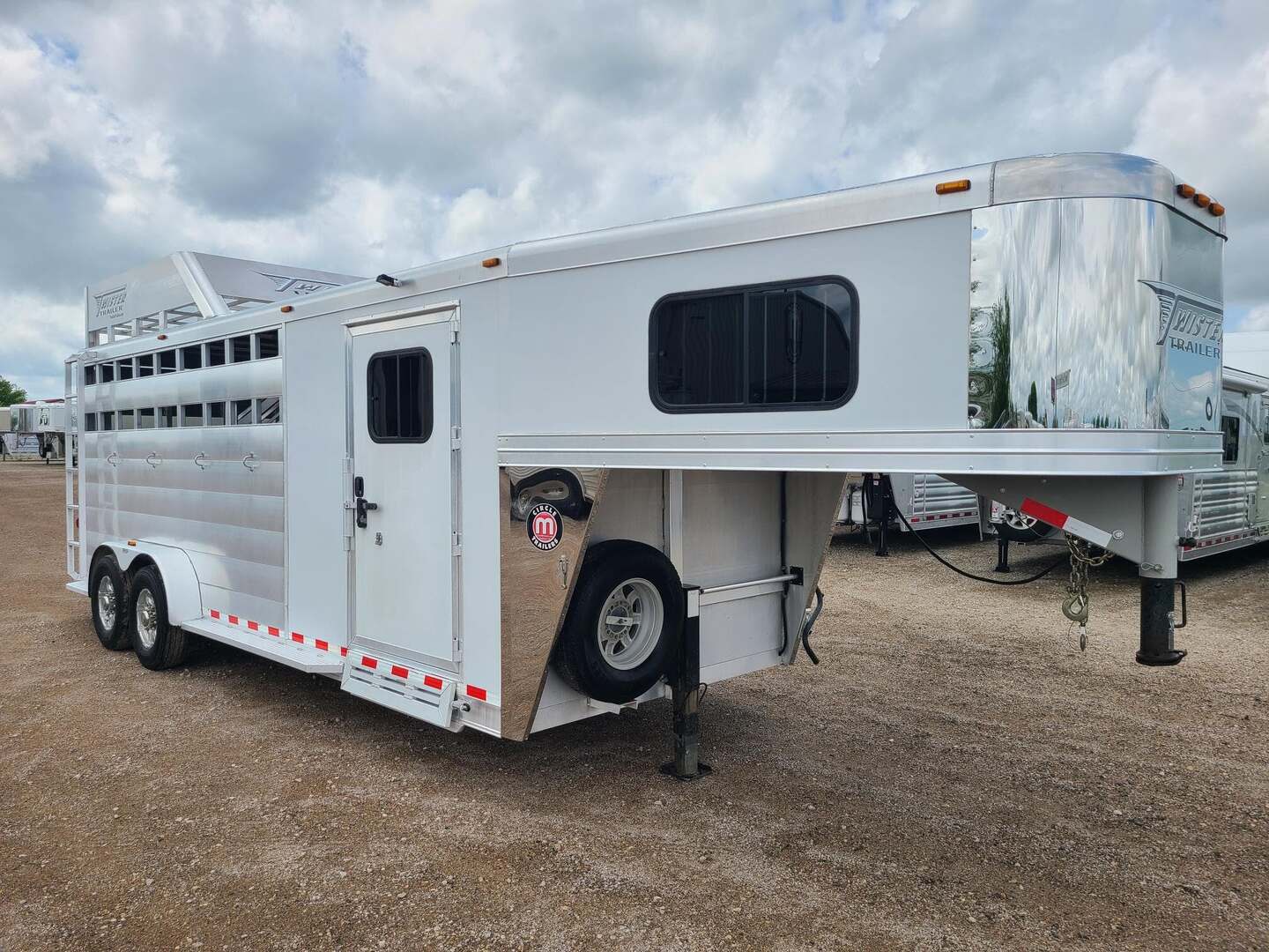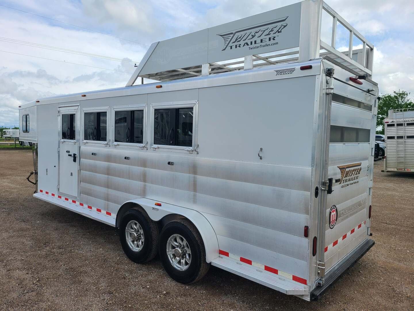 2019 Twister 4 Horse 7x21x7 tall Drop down windows on head side Drop down window bars Escape door on first stall Flow through dividers, stud divider on first stall Air cracks on rump wall and rear gate Aluminum wheels 6’ hay rack and ladder Swing out saddle rack in front dressing room 25 gallon water tank behind saddle rack Boot box at drop wall Shelf on curb side Swing out blanket bars on tack door Carpeted bulkhead wall with bridle hooks