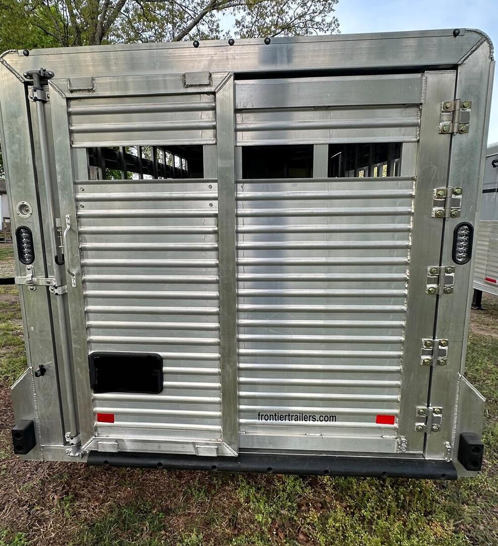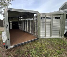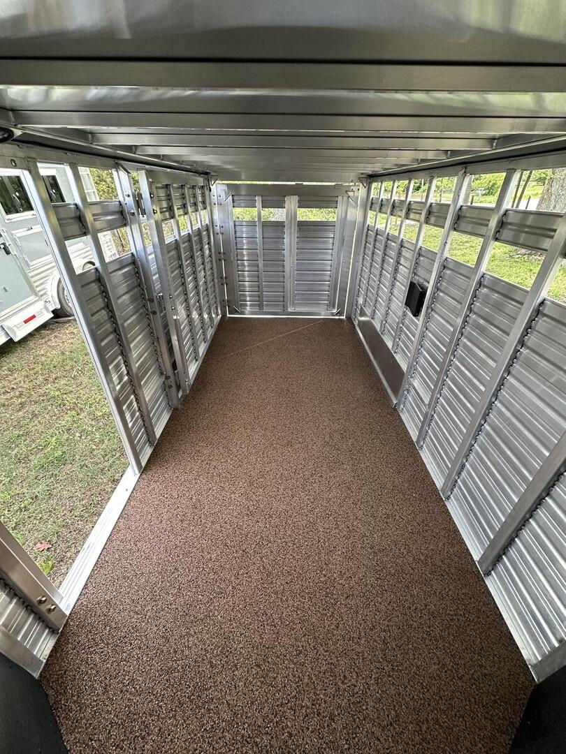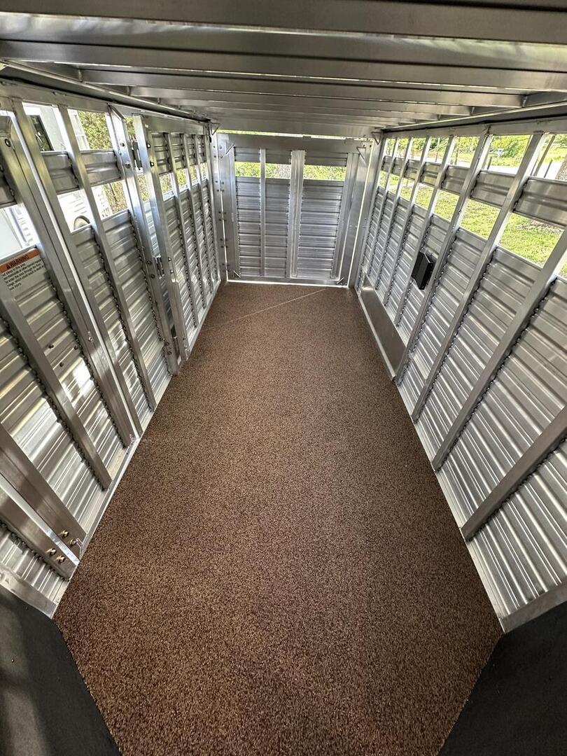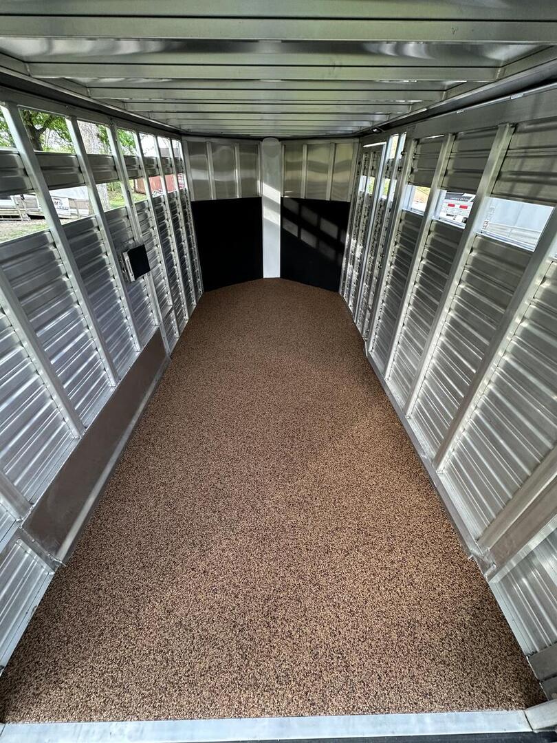 All-aluminum construction for lightweight durability and long-lasting performance. Features a V-nose design, extruded aluminum floor, full swing rear gate with slider, and side access door for easy loading. Equipped with spring axles and electric brakes for a smooth, reliable haul. Perfect for cattle, horses, or everyday farm use This trailer is also equipped with Hoof Grip flooring, it is slip resistant, shock resistant. It improves comfort and cleanliness