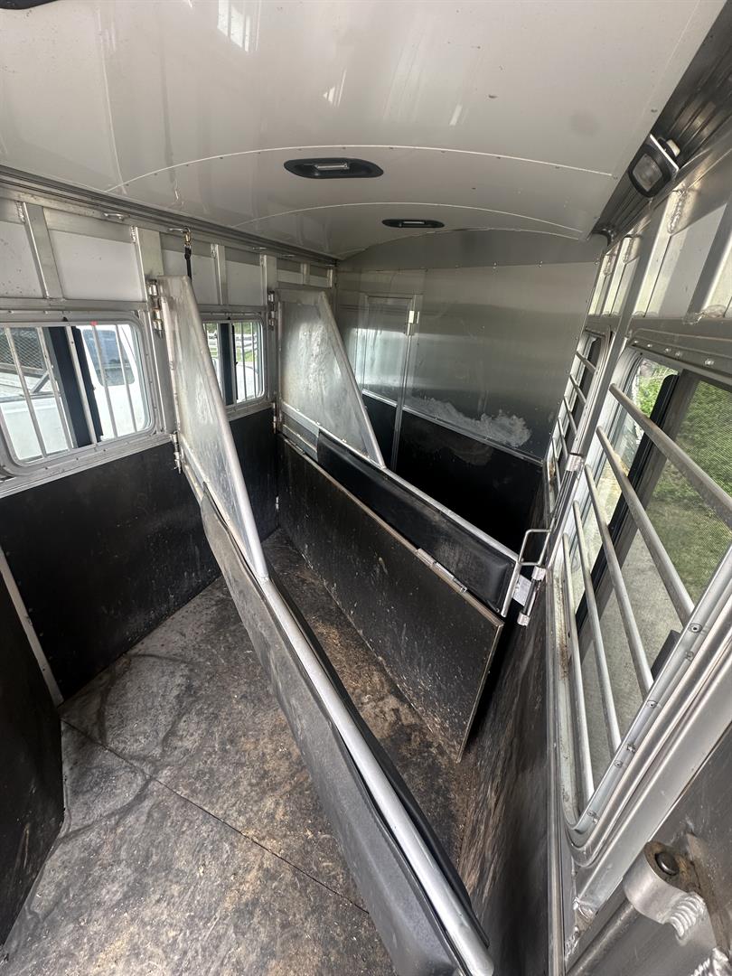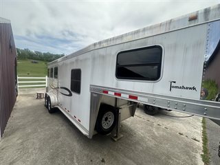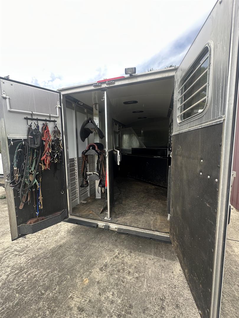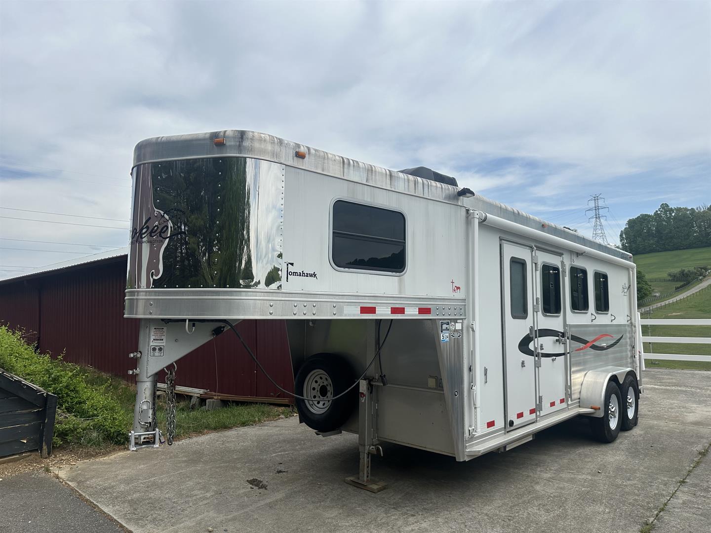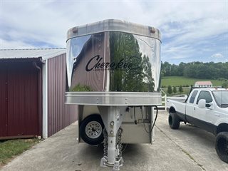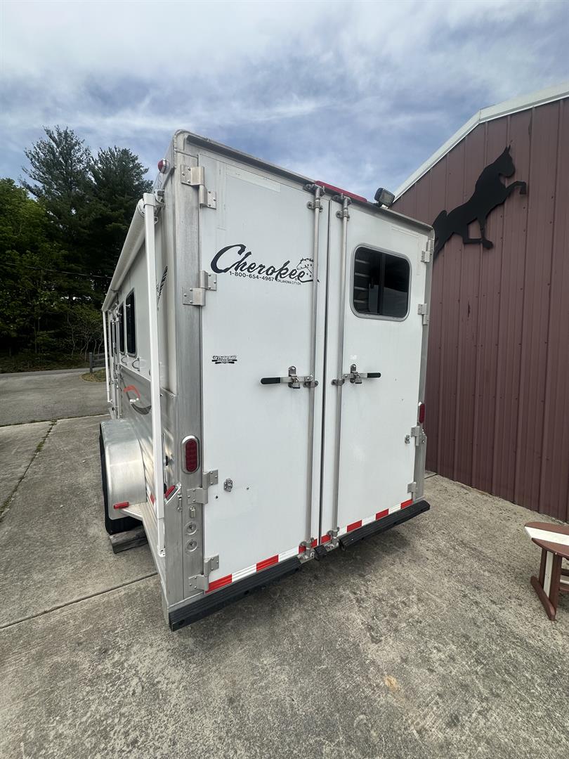 2009 Cherokee 3 horse slant load trailer with rear tack, walk through door, dressing room with bed on the floor, shelving, A/C, electric hook up, and manual awning.