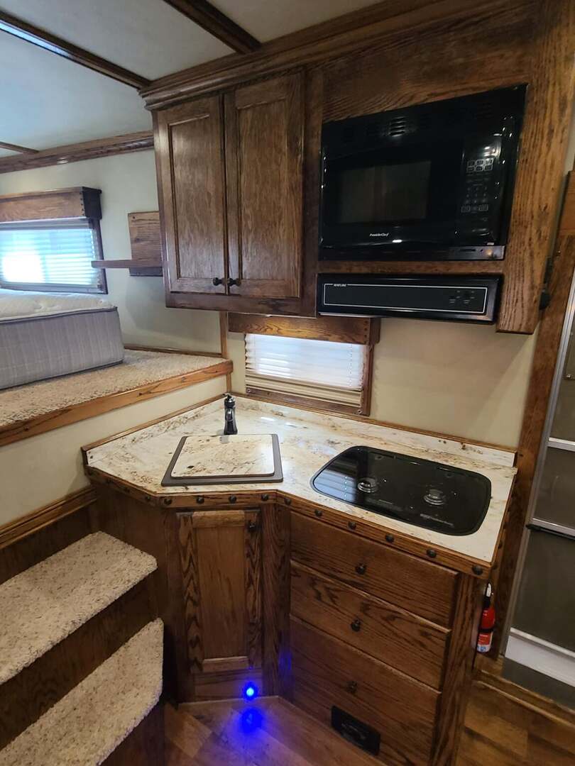 2020 Platinum Coach with 14’ Outlaw Conversion Living Quarter 8 x 30 x 8 tall 8000# axles, 14 ply tires, Aluminum Wheels WERM flooring Shocker Hitch 14’ Outlaw Conversion Living Quarter 7’ Slide with 72” sofa sleeper 15000 BTU A/C with Heat Strip 16000 BTU Propane Furnace 6.0 Propane / Electric refrigerator 6 gallon propane water heater 60 gallon water tank Quartz sinks in kitchen and bathroom Two burner recessed cooktop Microwave with vent hood over cooktop 32” radius shower with power vent overhead Vanity sink next to closet / toilet 24” walk through door to horse compartment Dual leg hydraulic jacks Double Aluminum Battery Box with On/Off switch Double 30# propane bottles 18’ power awning on passenger side 16’ total stock/horse area, 4’ tack area up front Plexiglas & Track on front 4’ section with rubber on both side doors Track for Plexiglas on rear 12’, no Plexi Full width spring loaded rear ramp Double rear gates No gen or pre-wire