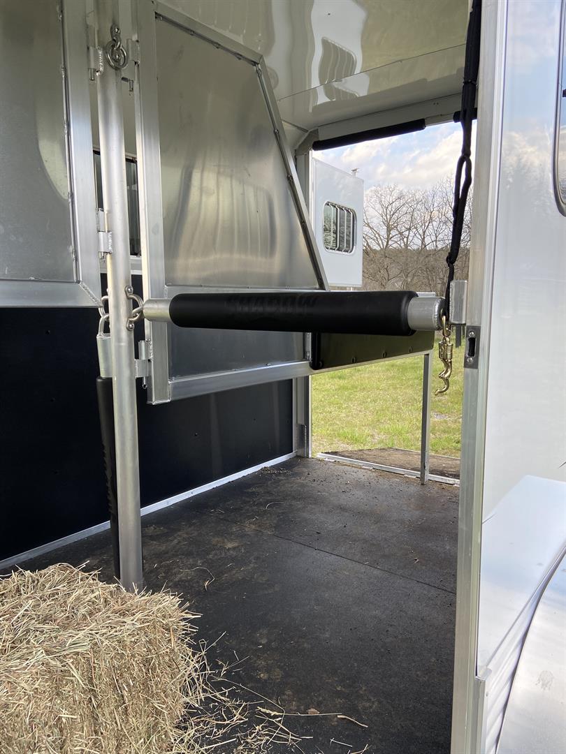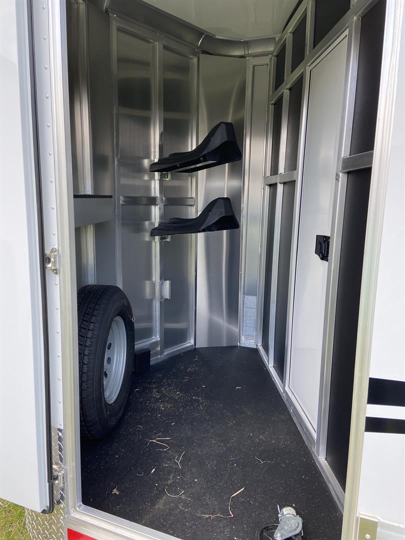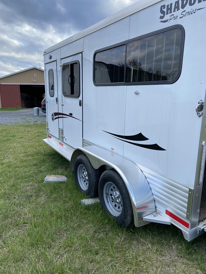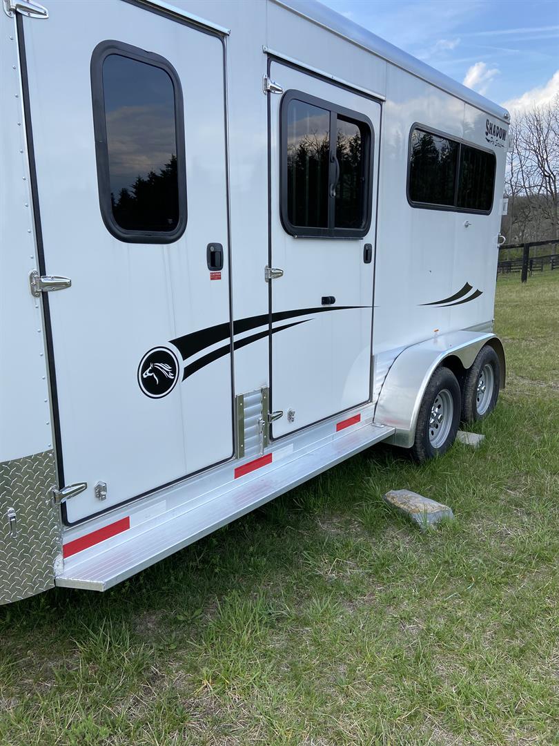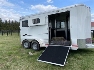 Beautiful 2-Horse trailer with Walk-through tack-room, 2 saddle and bridle racks. Insulated roof, fans and screens on all windows. Escape door/ramp. Trailer fully locks with key. Travels empty and full exceptionally well.