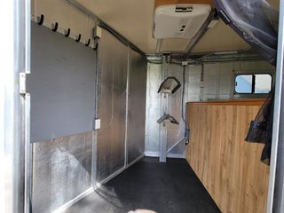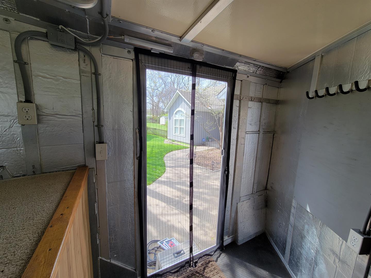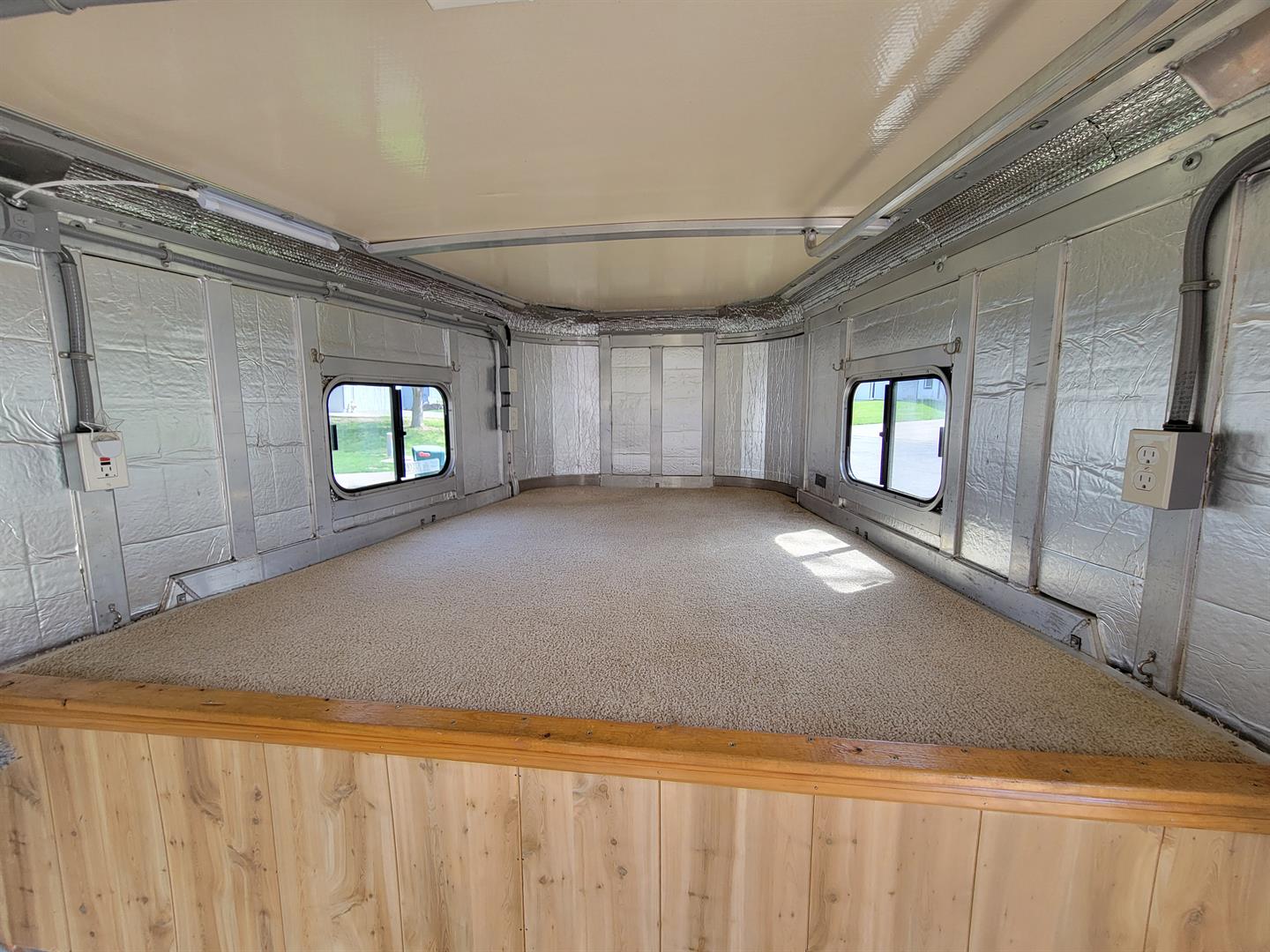 * Comfortable weekender camping for 1-2 people. Fully insulated and partially paneled. Will include matching paneling ready to finish the rest of the walls. Carpeted bed area, clothes hanging bar. When camping I move tack to the back and add area rugs, a dresser, mini fridge, and microwave (will include the fridge, microwave).