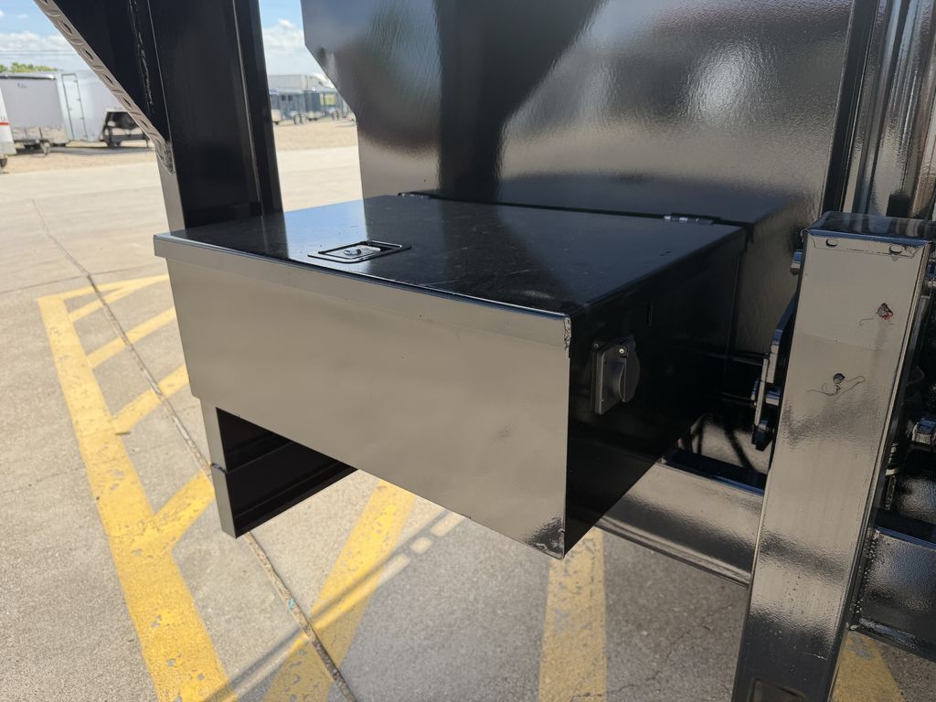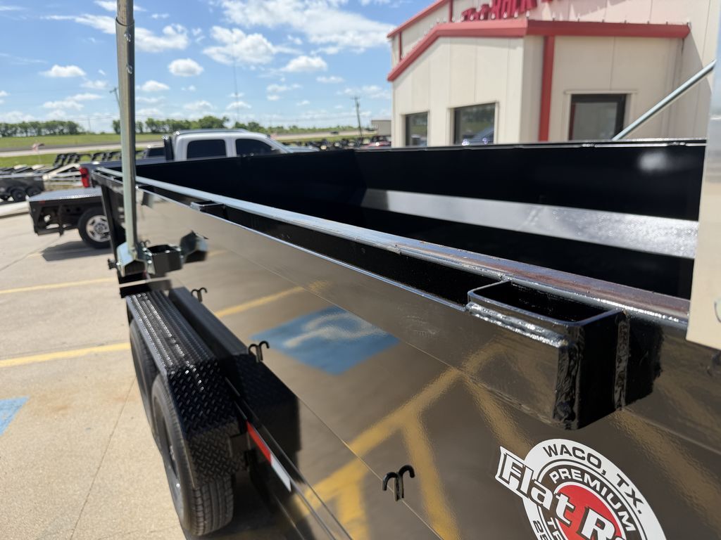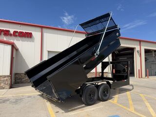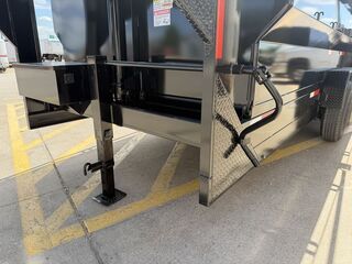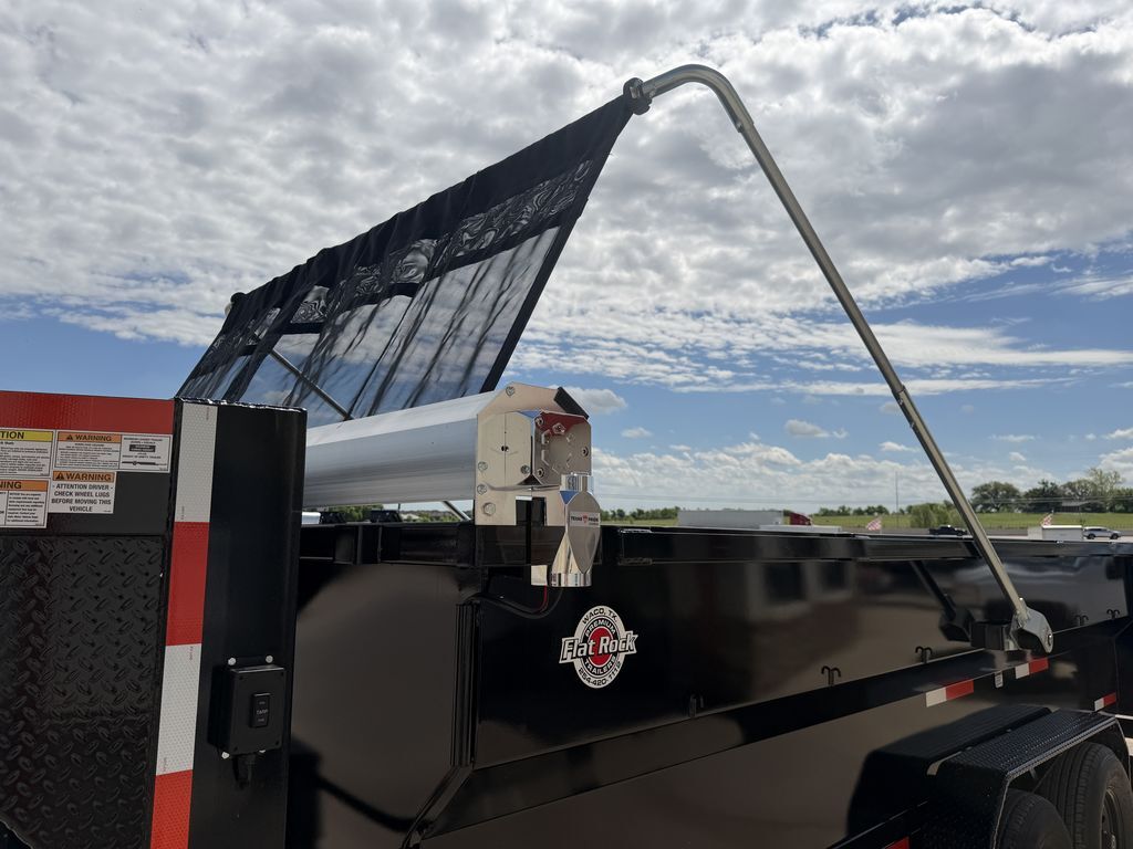 7’ x 16’ x 3’ Flare Side Dump Trailer ELECTRIC TARP SYSTEM HEAVY DUTY TUBE RAMPS 2 x 8,000 lb. EZ Lube 8 lug (Brakes on both axles) Heavy Duty Slipper Spring Suspension Tires: New ST235 85R16 LRE 14 Ply Radials) Main Frame: Full 6 in. channel Gooseneck Tongue: 8 in. Channel Risers and Beams Tilt Frame: 3 in. x 2 in. tubing Cross Members: 3 in. channel Bed Flooring: 1/8 in. thick sheet steel Bed Siding: 1/8 in. thick sheet steel Deck width: 82 in. Deck Length: 16’ Deck Height: Approximately 28 in. Side Wall Height: 36 in. Rear Doors: Double swing doors (open like barn doors) Battery: Group 24 deep cycle marine Pump: Electric over hydraulic (1.7 gpm) Controller: 15’ corded remote control Front locking toolbox contains battery and pump Hydraulics: Single 3 stage hydraulic cylinder (14,000 lb.) 2 5/16 in. Adjustable GN Coupler Two heavy duty safety chains Jack on Gooseneck: spring loaded drop leg Fenders: 14ga heavy duty tread plate Lighting: All flush mount or recessed lifetime LED   Empty Weight 4,700 lb. G.V.W.R. 16,000 lb. Carrying Capacity 11,300 lb.