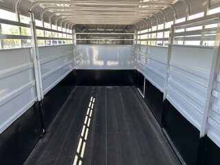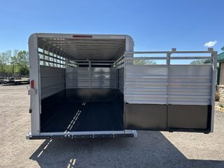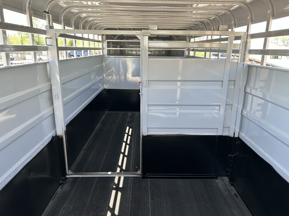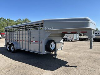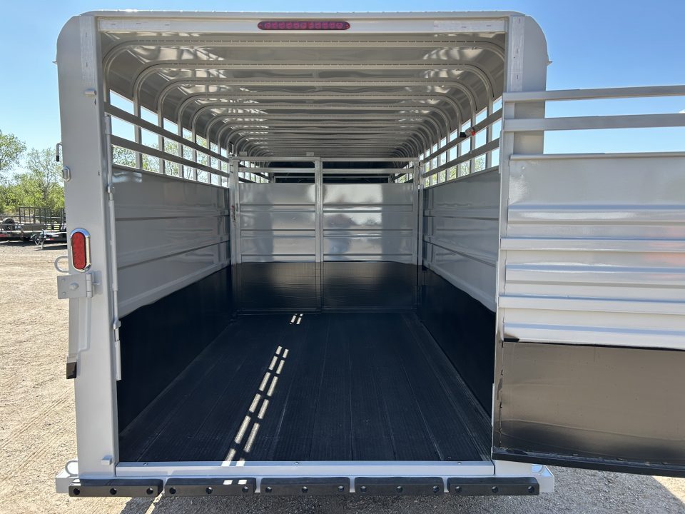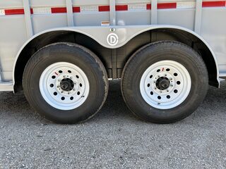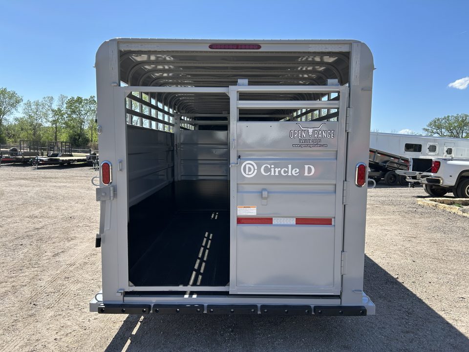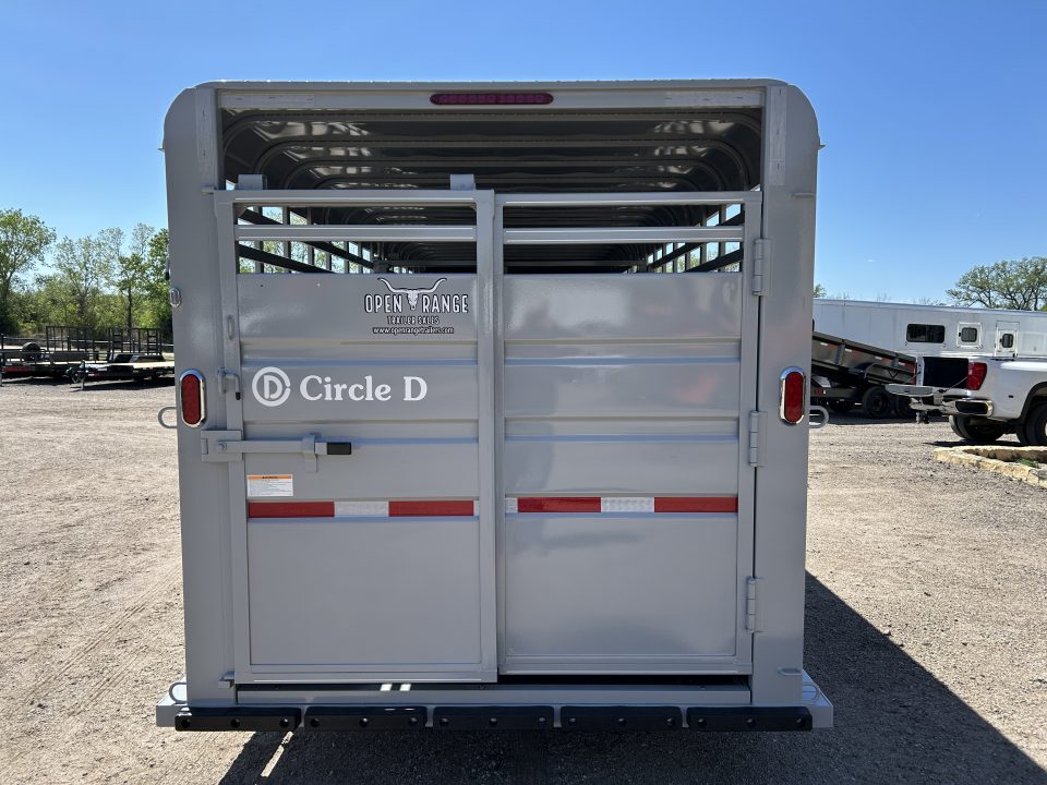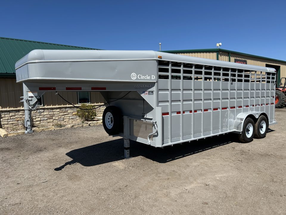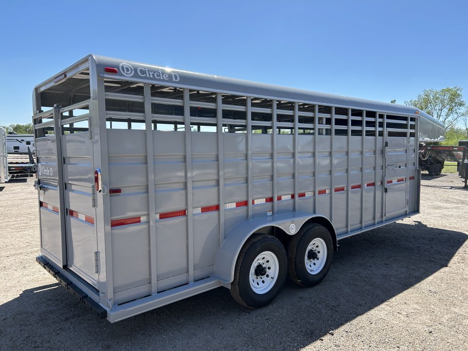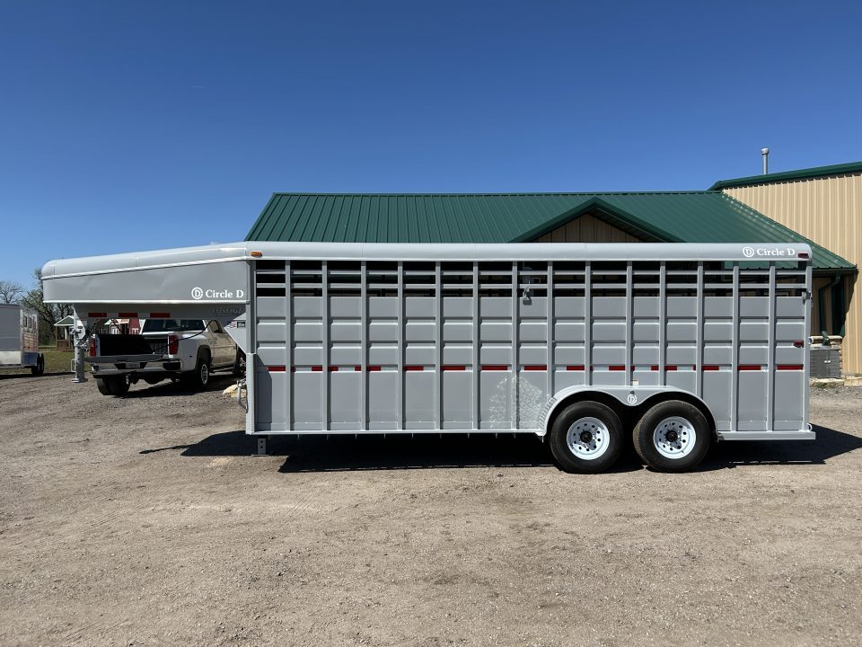 2026 Circle D 6’8”x 20’ Livestock Trailer GVWR 14K 2- 7K Torsion Axles Electric Brakes ST235/80R16 E Radial Tires Smooth Shelby Flooor 12” On Center Crossmembers Spare Tire 1 Cut Gate With Sliding Sort Gate Color, Silver/ White