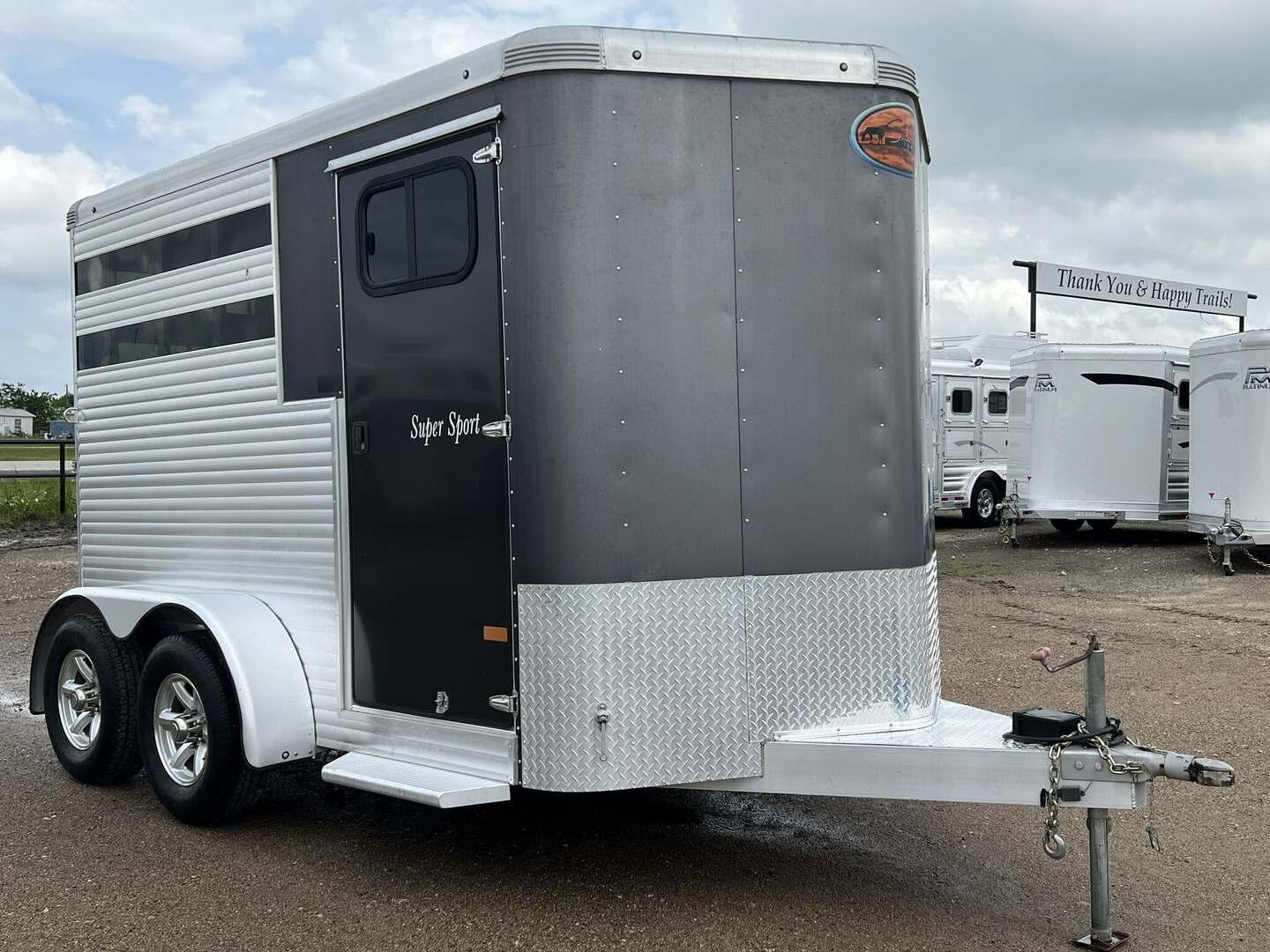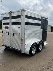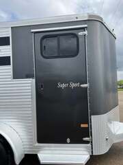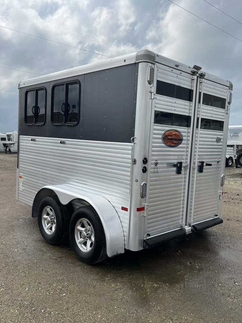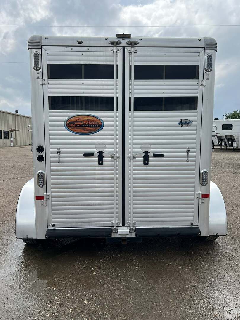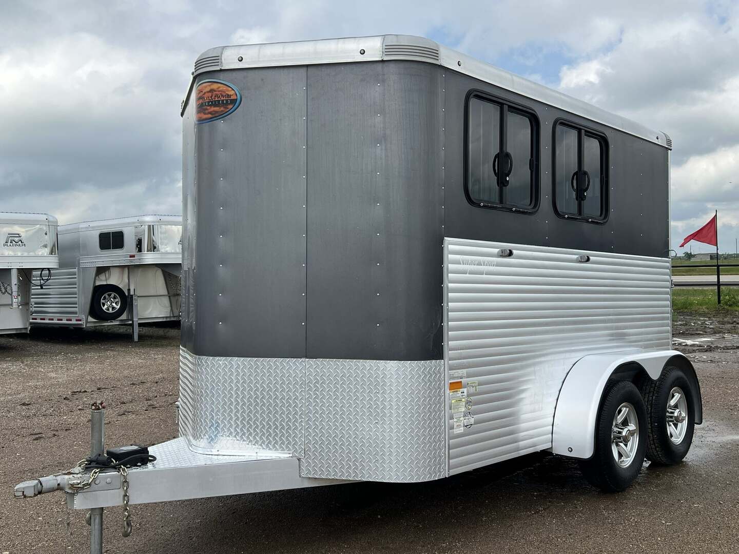 2017 Sundowner 2 Horse Bumper Pull SUPER SPORT 6’9” wide x 13’ long x 7 tall Drop down windows on head side, slats on rump wall Saddle rack and bridle hooks in dressing room Double rear gates Aluminum wheels on 15” tires 3500# axles Aluminum gravel guard
